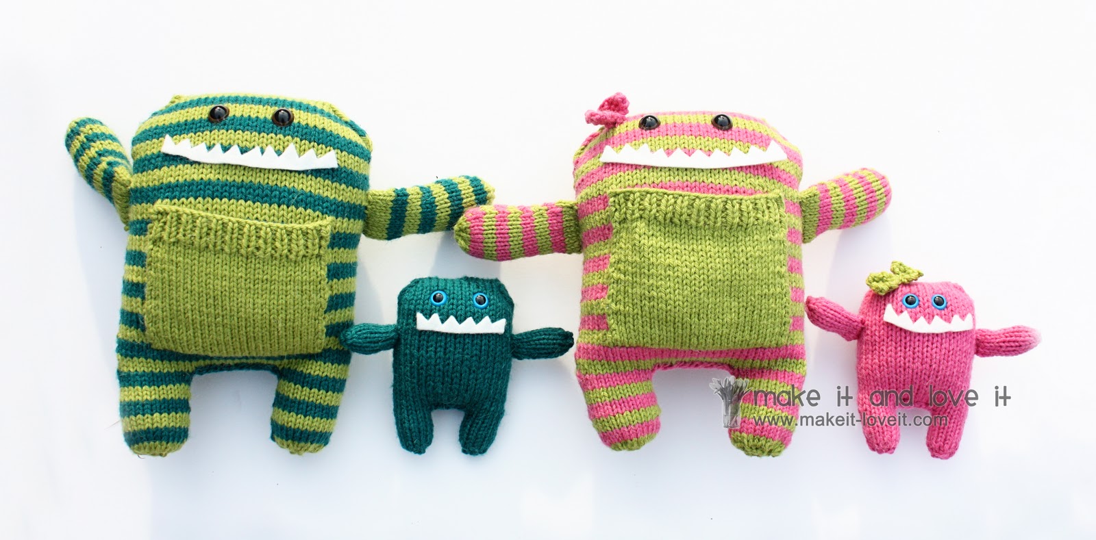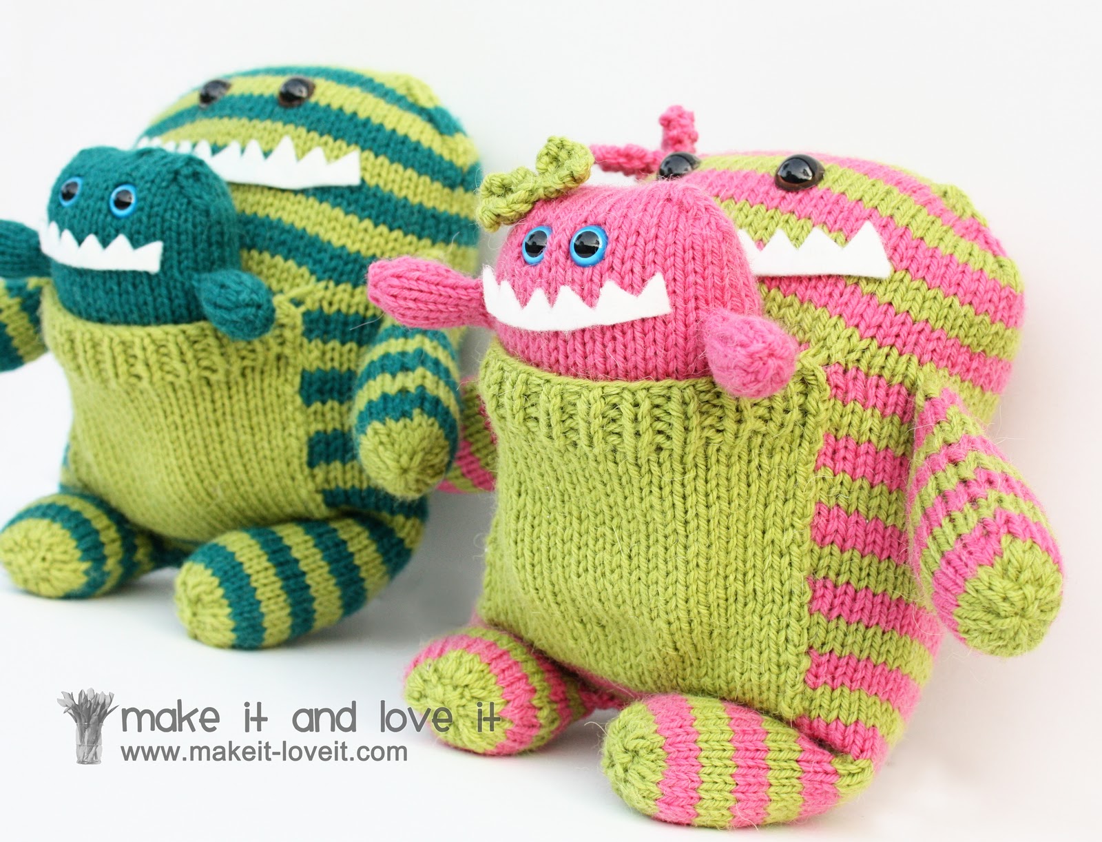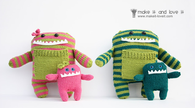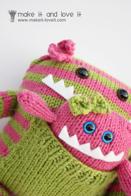 And to make the green/pink set more girly…..my sister added little bows to the monster’s heads.