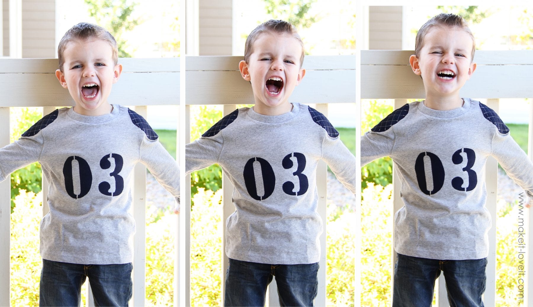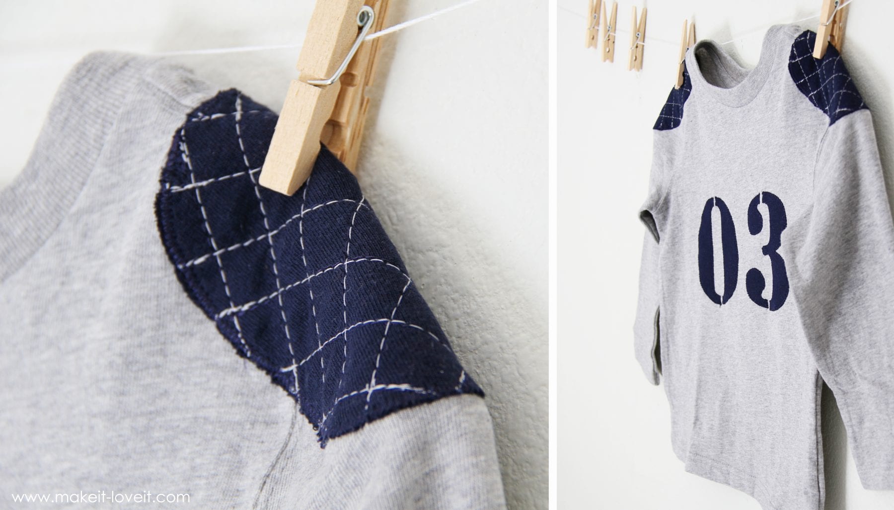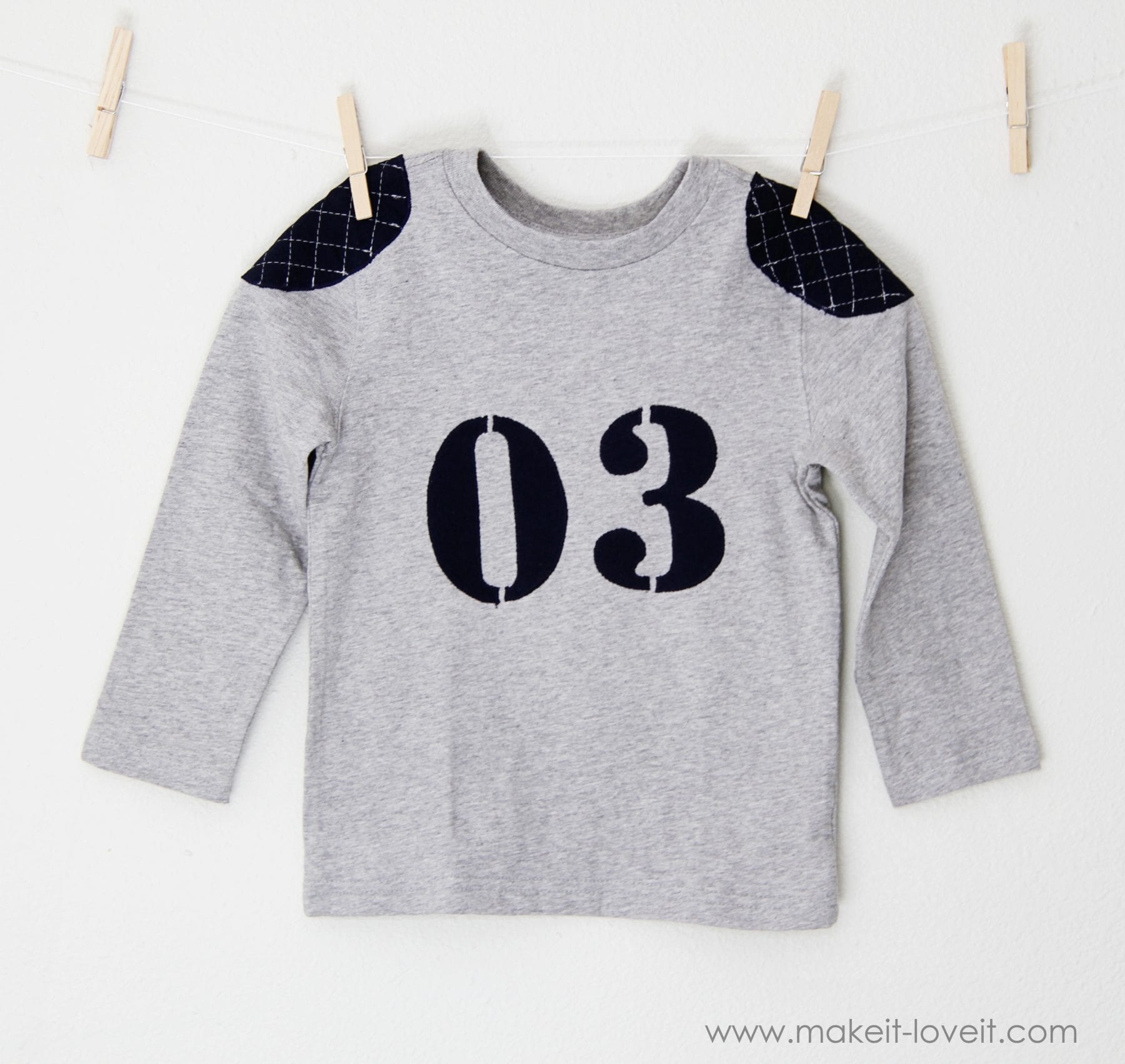 So when I was turning a plain long sleeve T into a sports-like shirt, with the number 03 (because he’s 3) on the front……I decided to make it look more football-ish, and add mock shoulder pads.Â