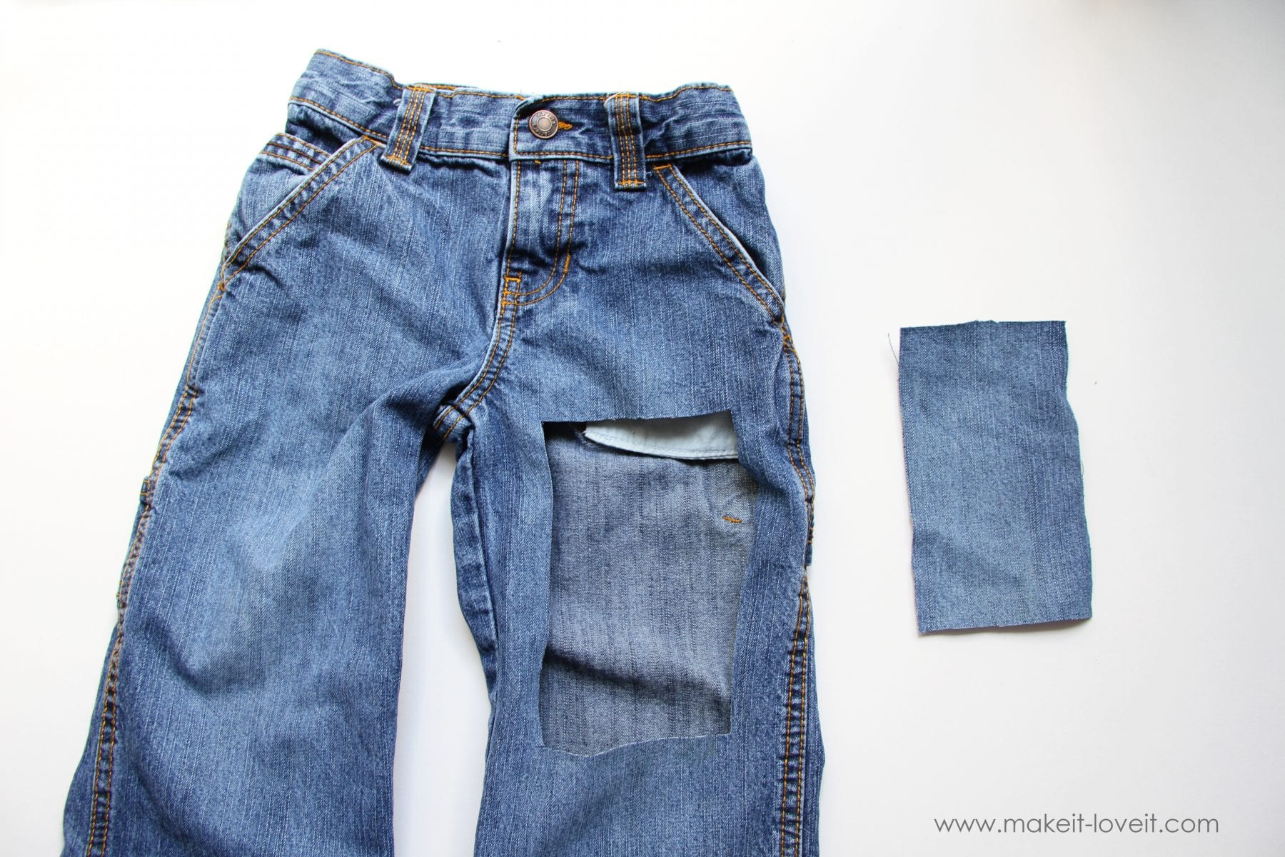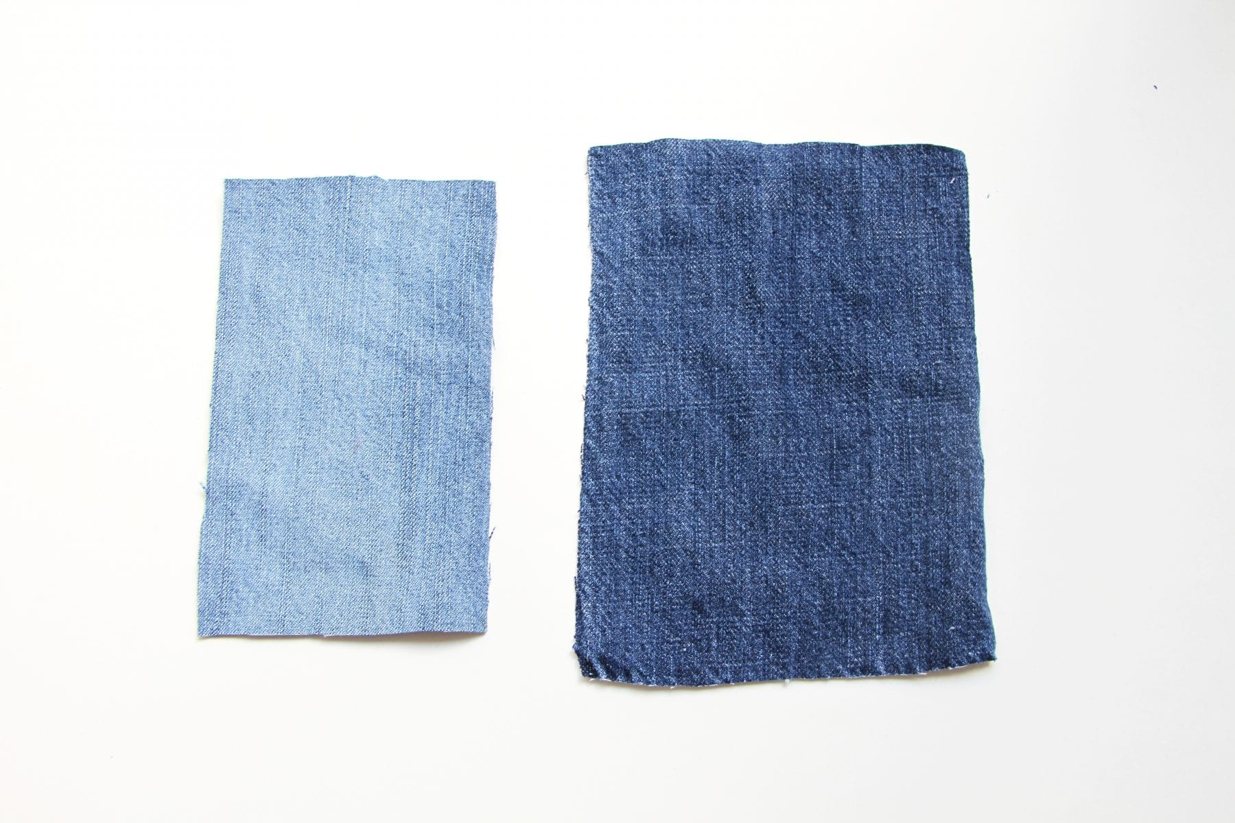 Then I dug into my jean fabric scraps and cut out a rectangle that was about 3/4 of an inch bigger on all sides. (The original rectangle is on the left.)