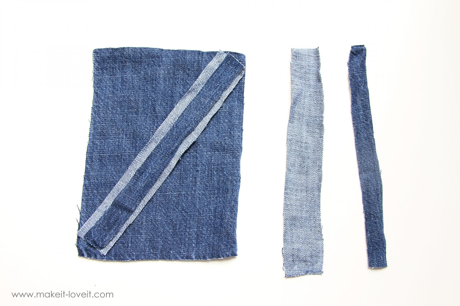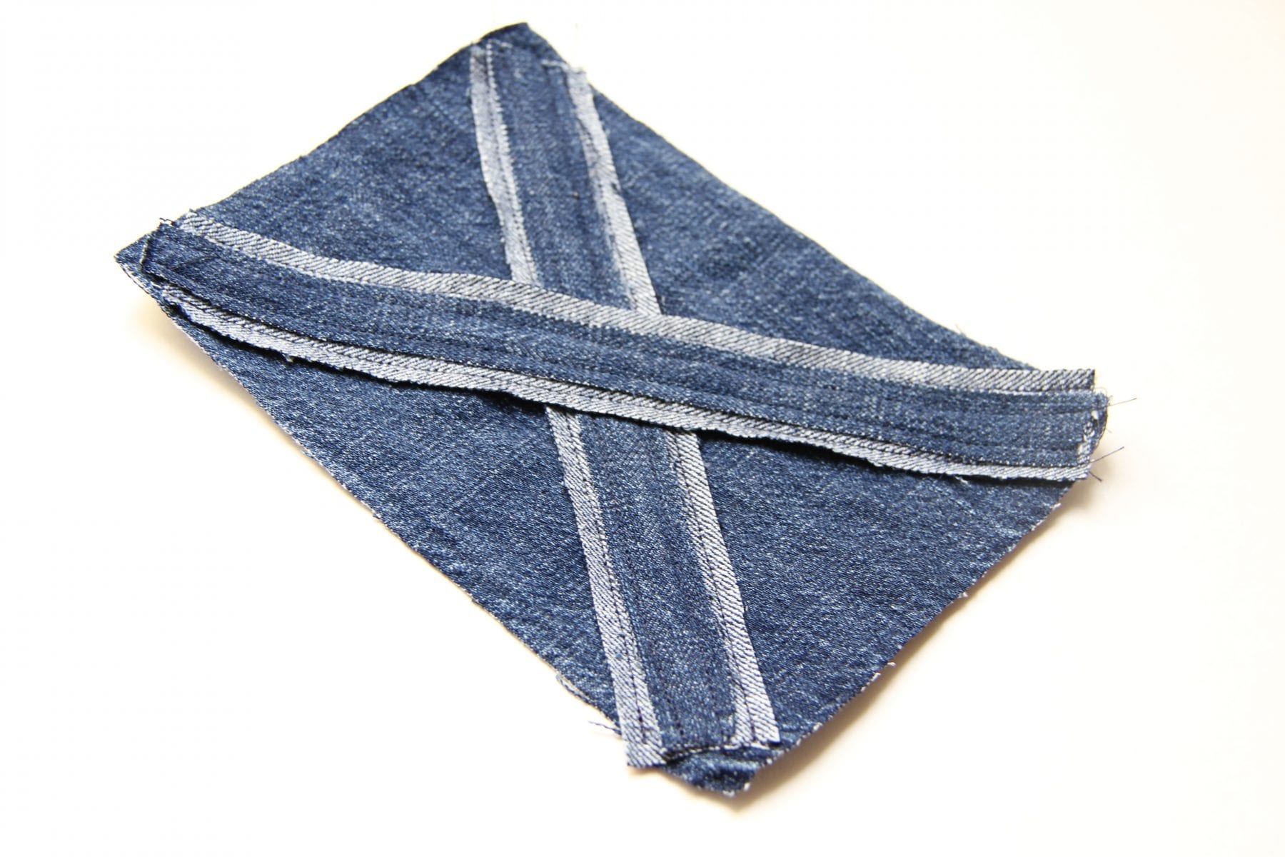 Then I cut strips to make an ‘X’ on the front. I needed a wide strip and then a narrow strip to go on top. The wide strip was just the denim face down and the narrow strip was the denim face up.