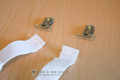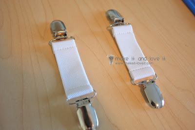 You can also use regular suspender clips (or cut some off of an outgrown pair) and then add elastic. But like I mentioned above, I just couldn’t find any at the store…..and then realized these would work even better.