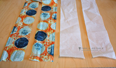 Then I cut two strips of fabric and two strips of interfacing that were 19 1/2 inches long by 2 1/2 inches wide. (You will have to determine how long to make your fabric by measuring your child. I put my boy’s pants on, put the clips in place, and then measured from the front clip, to the back where I would attach it to the elastic. That turned out to be 18 1/4 inches. Then I added an extra inch for the front and a 1/4 inch for the back. You’ll see why in later steps. As for the width…..the pieces of elastic on my clips were an inch wide, so I knew I needed to make tubes that were at least an inch wide, so that the elastic could fit inside. That will make more sense as you read on as well.)