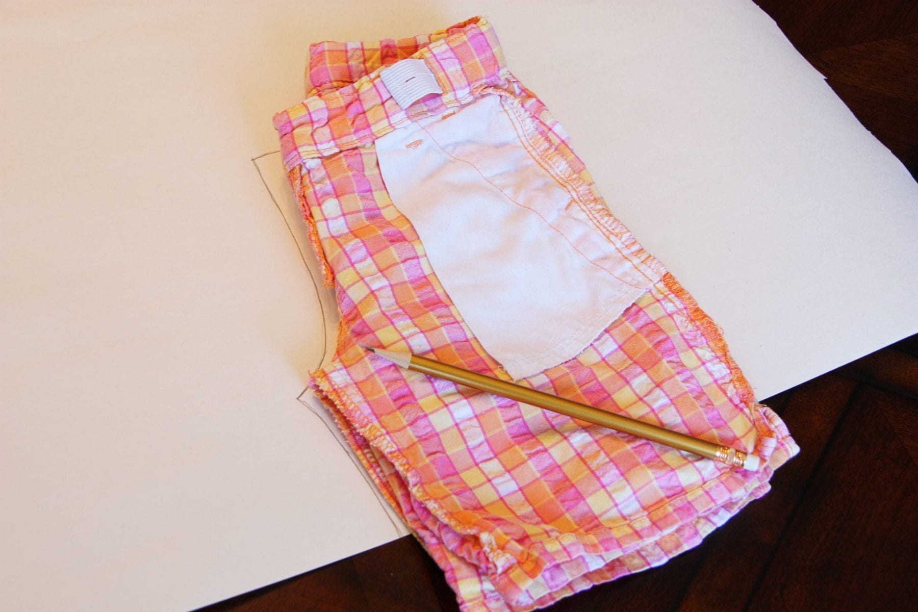 Then I turned them inside out and used them to make a pattern shapes for the front and back pieces for the shorts (like I’ve done here).