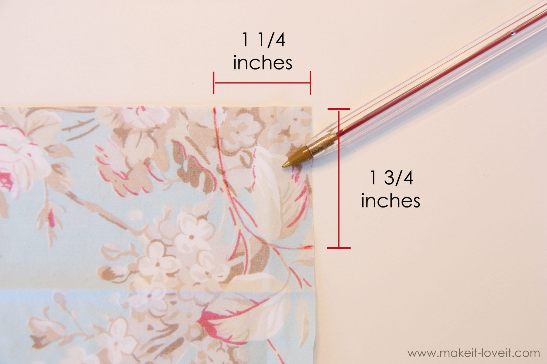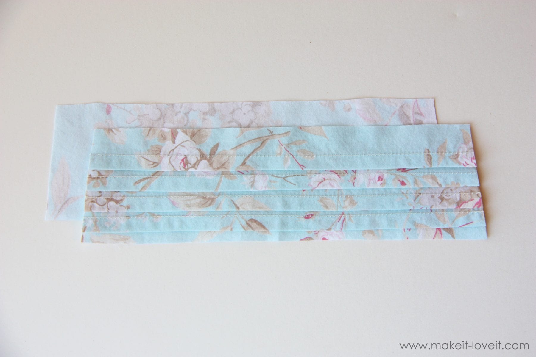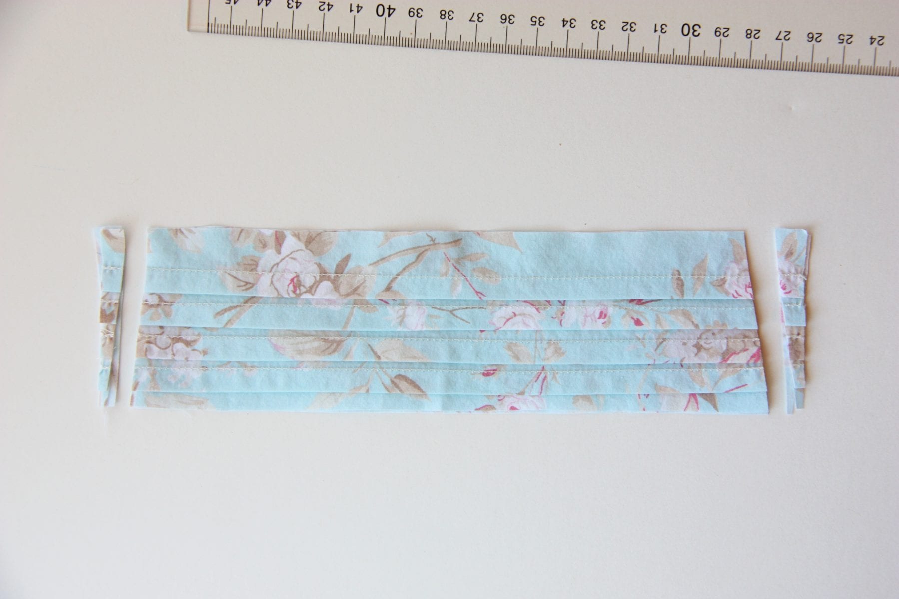Now, onto the pleated piece. I knew I wanted a piece that was 7 inches across and 1.5 inches tall. So I cut a piece of fabric that was about 8 inches wide and 6 inches tall. Then I created four 1/4 inch pleats, that stretched across the width of the fabric. (Need help making pleats? Click here.) Make sure to start your first pleat about 3/4 inch from the top and stop at least a 1/2 inch from the bottom. Iron your pleats flat.