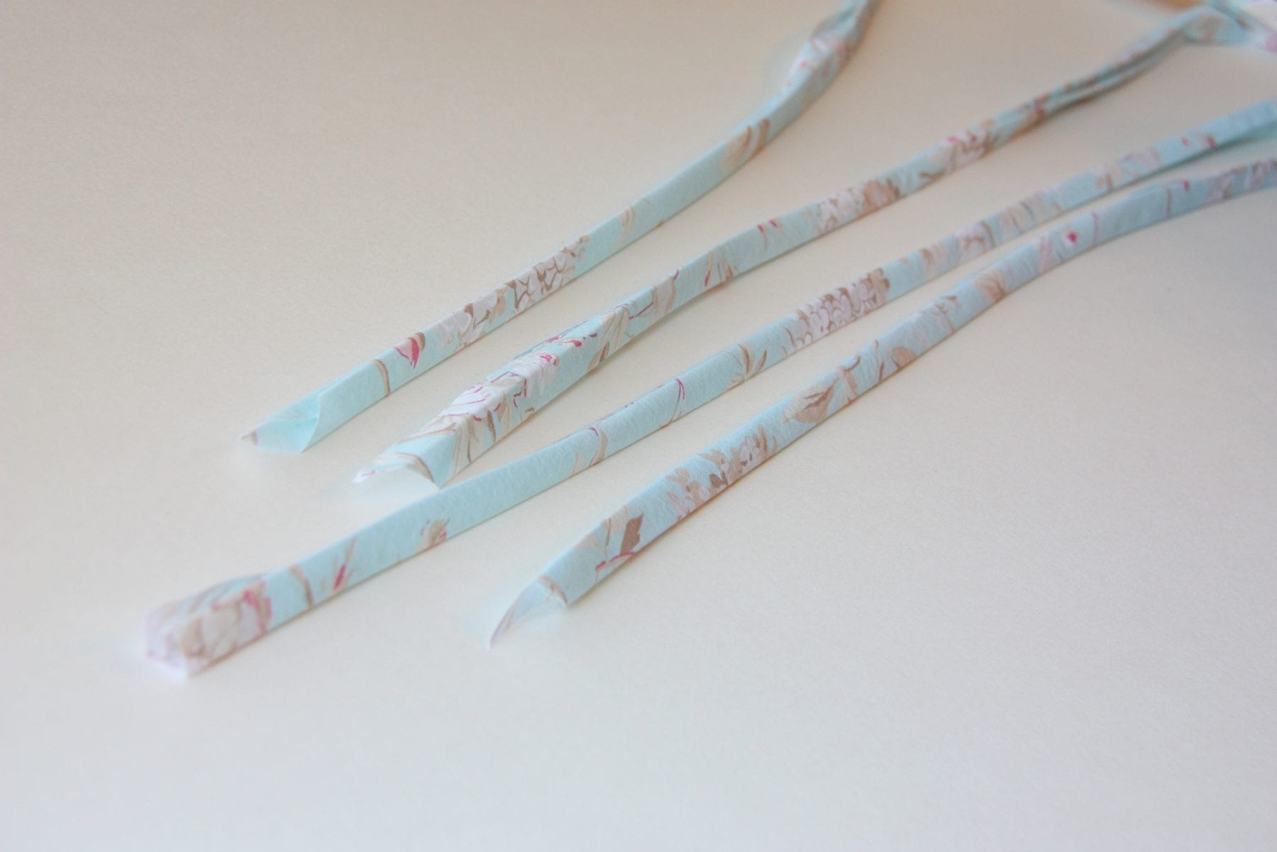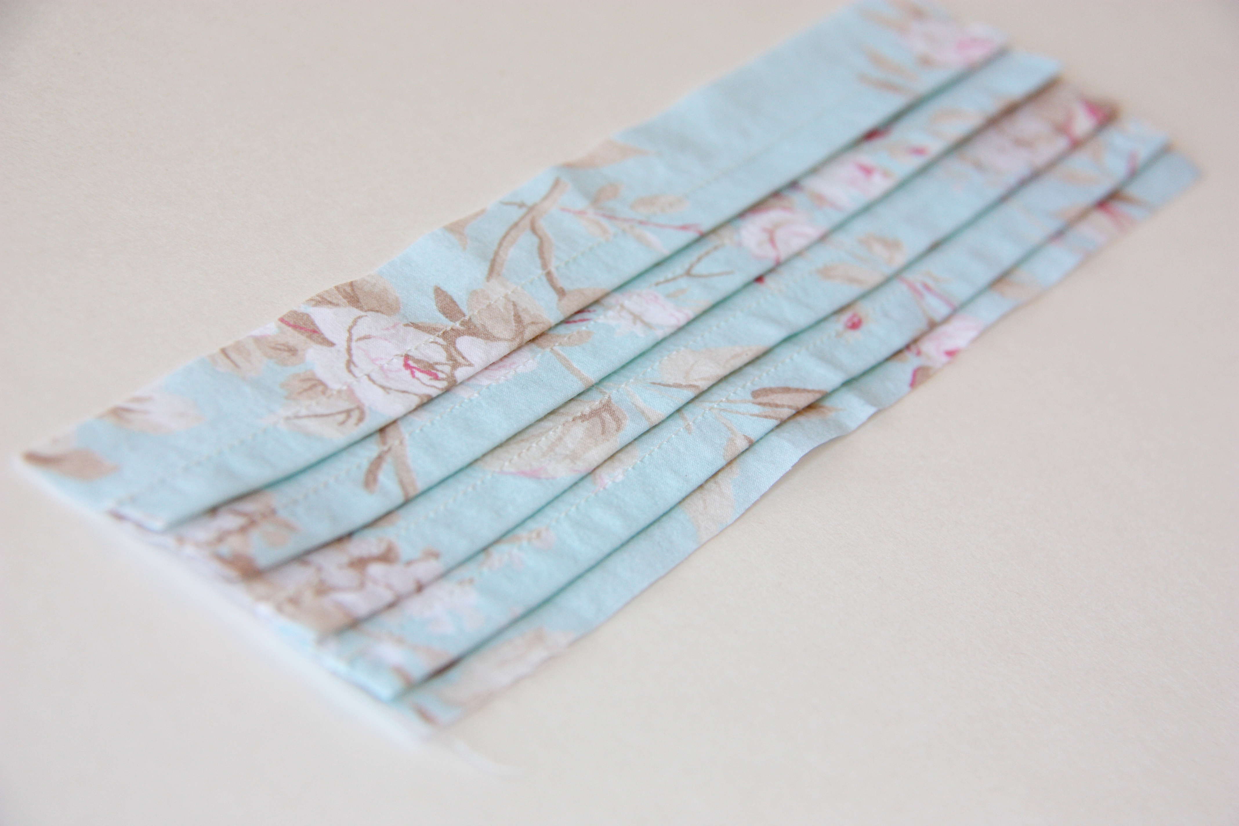 Next, create 4 long strips of bias tape. (What’s bias tape? Click here.) I made mine by cutting out 4 long strips of fabric that were 2 x 20 inches. Then I folded them in half and then folded the edges in towards that center fold and ironed them all again.