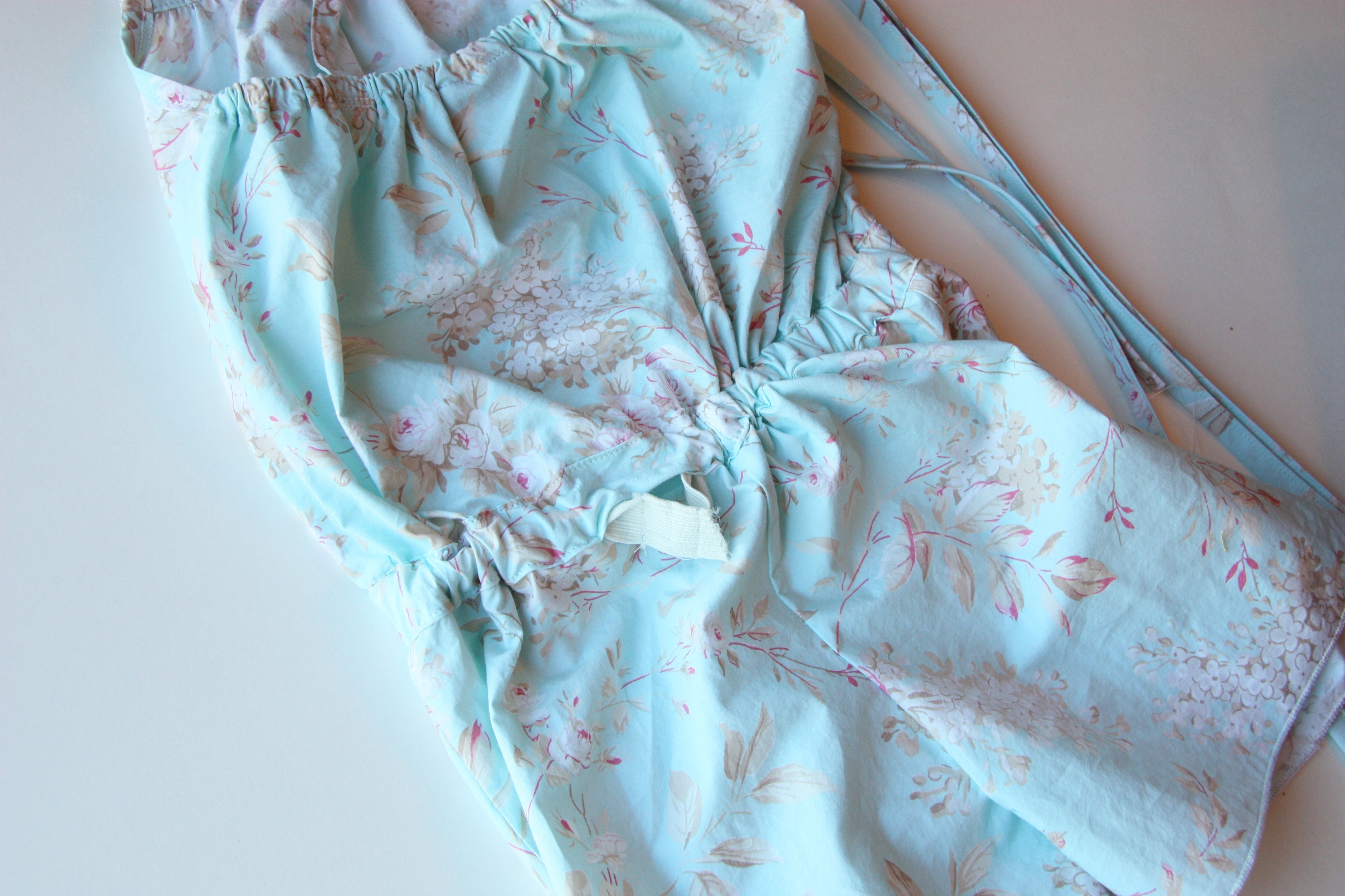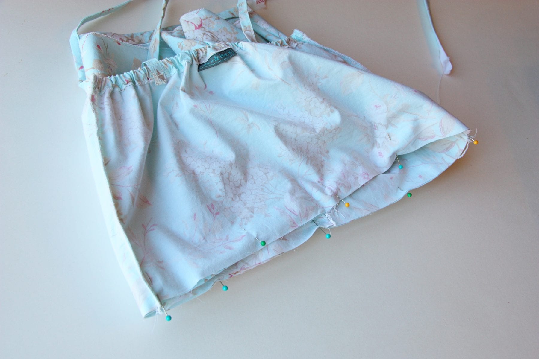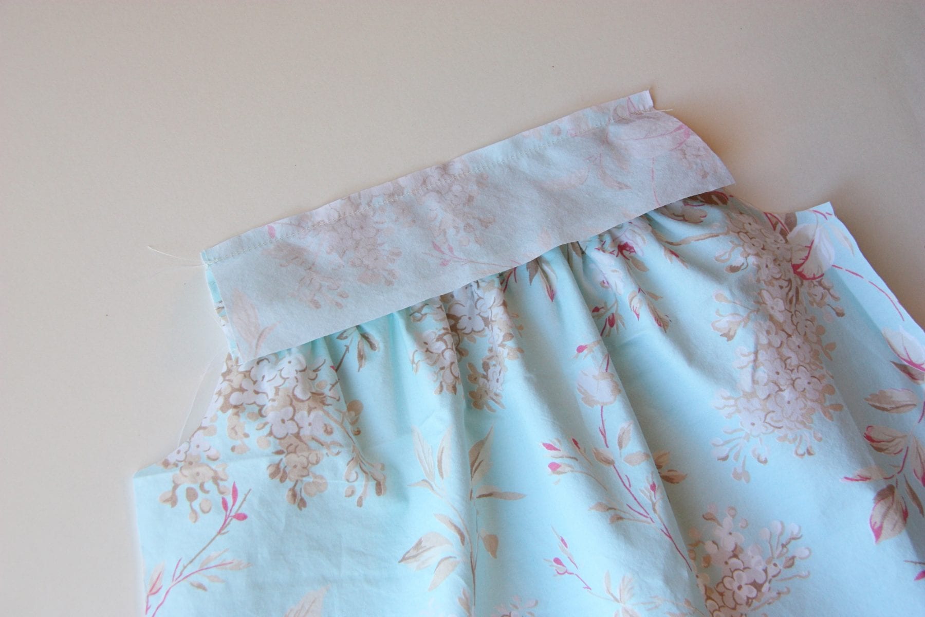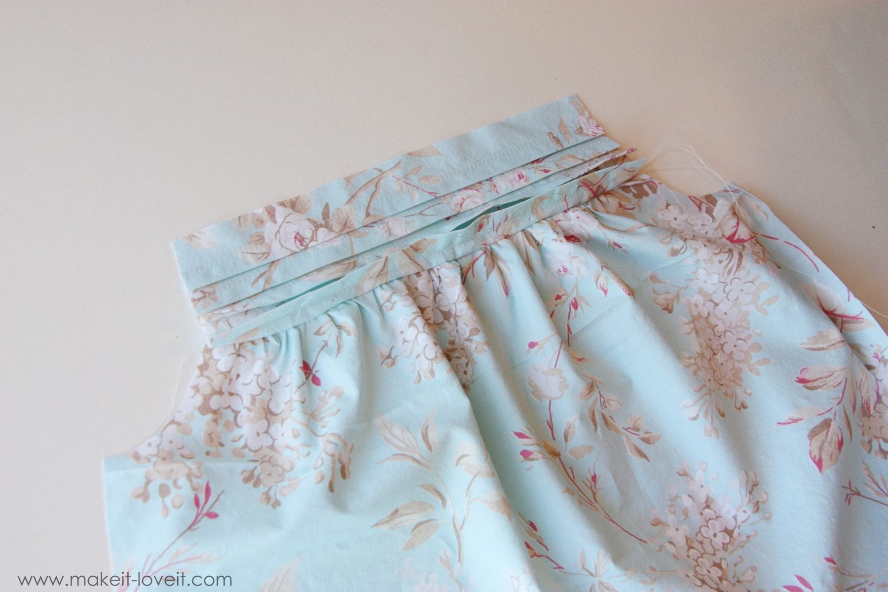 Now, hem under the bottom of the romper using a blind hem (found here) or by hand-stitching (found here) or just sew it like normal on the sewing machine. Make the length just how you want it.