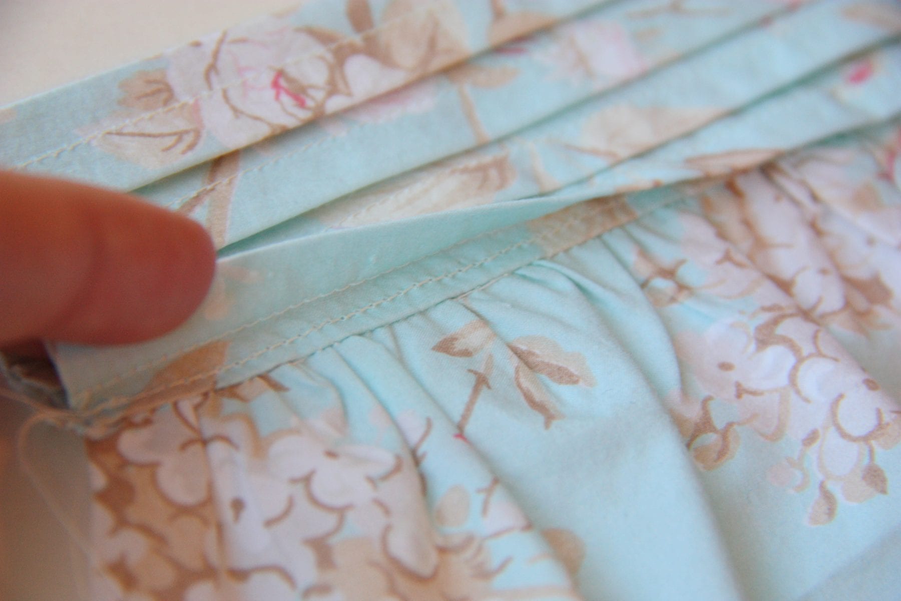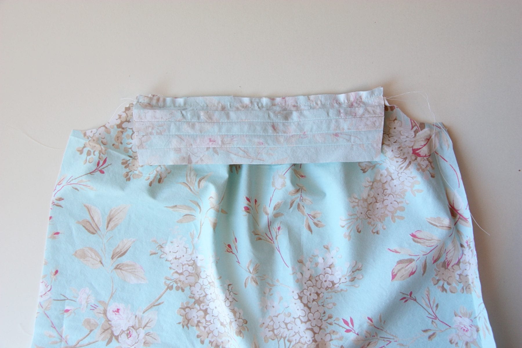 Then turn it over and fold under the bottom edge about a 1/2 inch, so that it lines up with the seam that joined the pleated section to the main piece. Iron in place, then sew along the bottom edge, making sure to not catch the bottom pleat in your seam. (You may have to pin that bottom row of pleats up again to help it stay out of the way.)