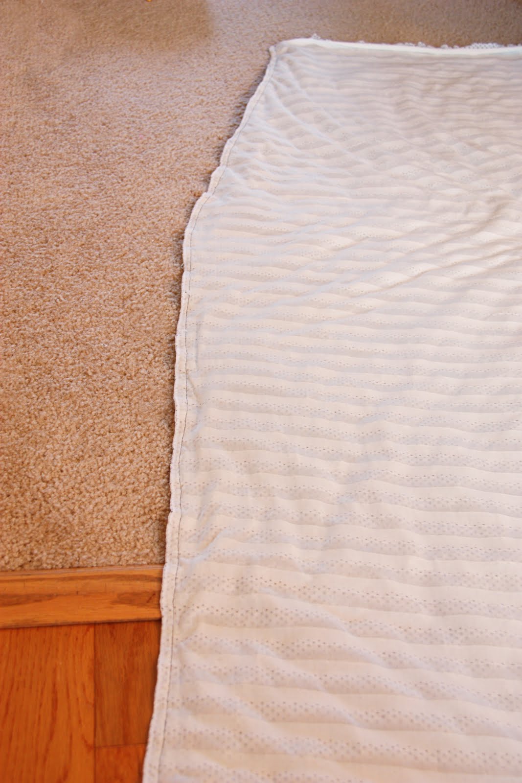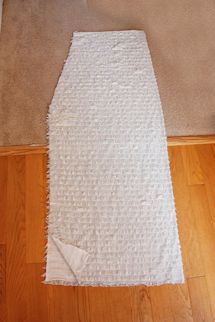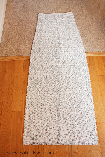 (**This fabric comes about 50 inches wide……so if you want your dress to be bigger than 50 inches around at some point, then you’ll need to buy twice as much fabric and sew a front and back piece…..with seams on the sides instead of one down the back like I show here. And then you’ll have to curve in both sides with your scissors. I originally had 2 yards to work with, and had some leftovers.)
