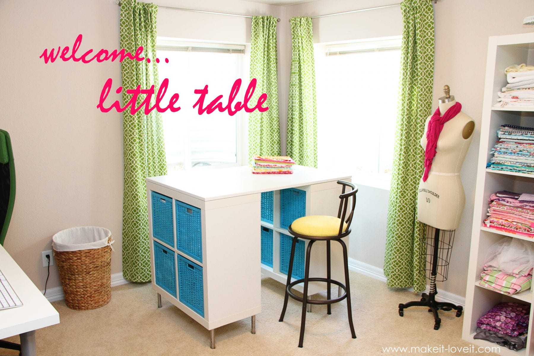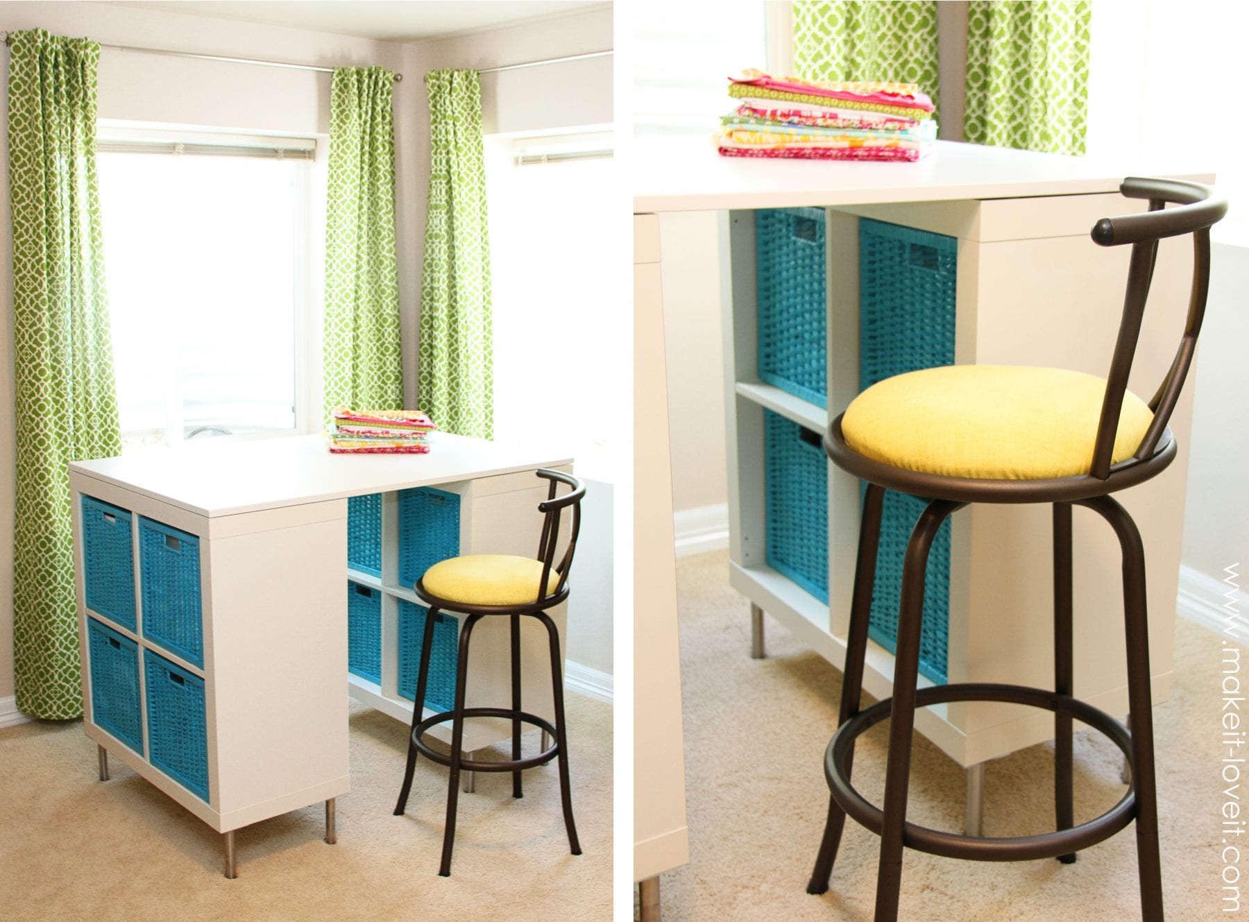 **In case you’re wondering, I bought the chair here, and just re-covered the seat with a punch of yellow fabric. It’s the perfect height for my 38 inch high craft table.  Also, the baskets are from Ikea (I couldn’t find them online though).