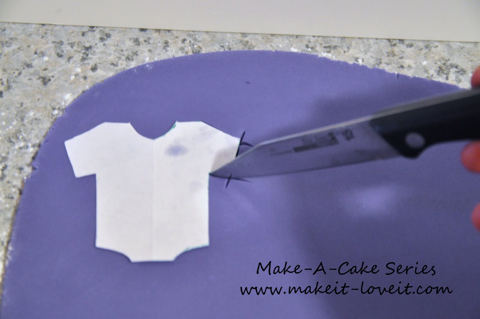 Lay your cut-out on top of the fondant and using a sharp knife or (exacto knife) cut out a onesie.
