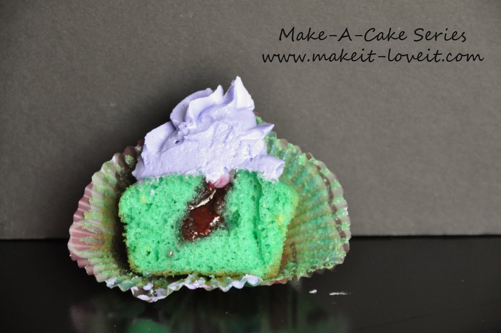 Cut tip off of piping bag and drop filling tip into the bag and fill the bag with any type of jam you like. Insert the tip halfway into the cupcake and squeeze a small amount of jam into the cupcake.