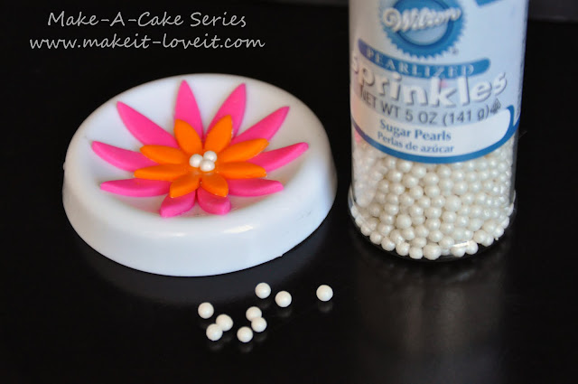 Again, add a tiny bit of water to the center of the flower and then press three pearlized round sprinkles into the gumpaste.