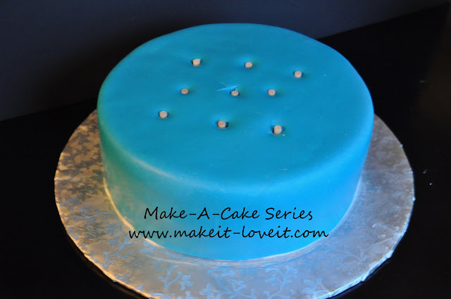 Insert the dowels into the cake. Stay close to the middle where the smaller cake will sit.
