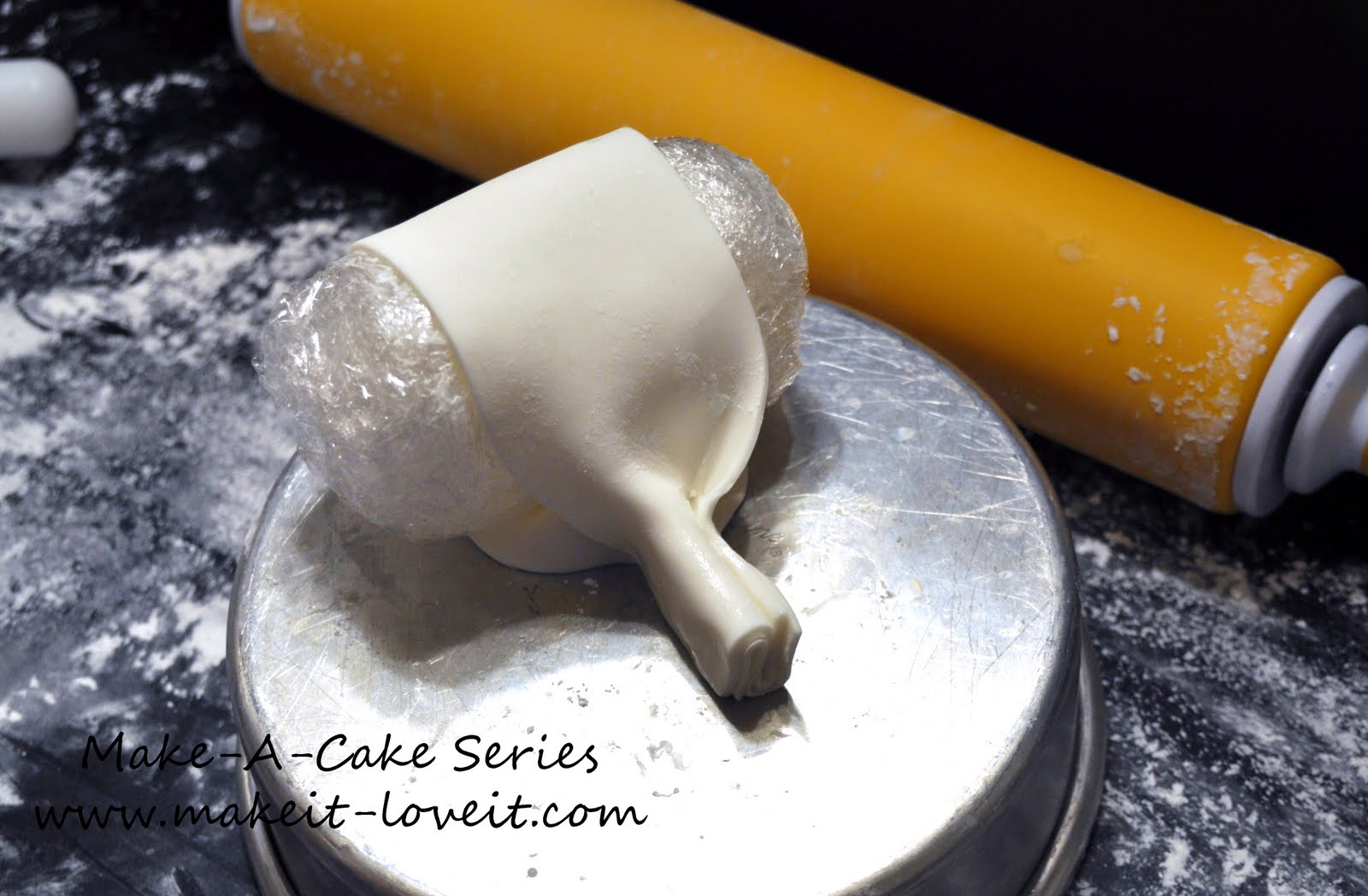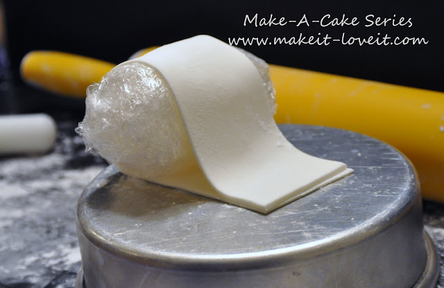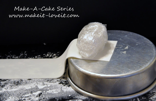 Lay the gumpaste over the saran wrap and glue the two ends together with a bit of water.