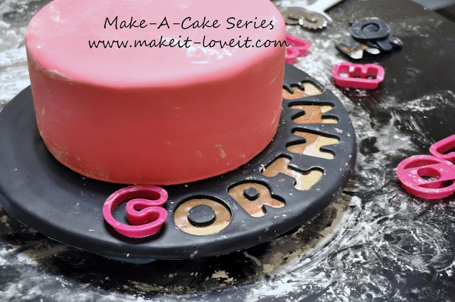 The first thing I did was to cover the cake board with fondant. Then I cut out her name and placed it down flat on the edge of the board with another color.