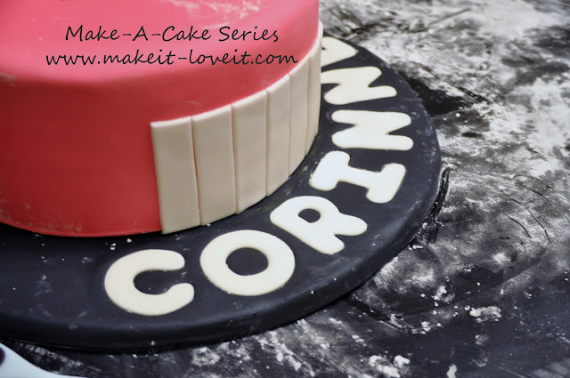 Then, cut the name out again in the white fondant and then fill in the spaces on the cake board.