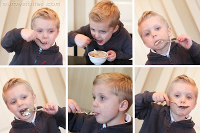 Not only was this kid super happy to be eating a treat, he had noooo idea it was just bananas. Muah ha ha ha ha! Total victory moment for Mommy. Plus I won super-mega-cool-Mom-points by saying, “Why, yes son. Yes, you can have ice cream for breakfast today”
