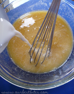 Add your eggs, milk, and vanilla to the melted butter and whisk it to combine.