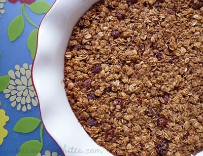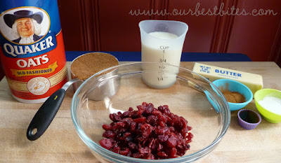 You’ll need oats (duh, right?! But don’t get the quick-cooking ones), milk, some kind of dried fruit (I love craisins, but raisins, cherries, coconut, or even dried apples are all good), eggs (these are not cookies), 3/4-1 cup of brown sugar (I do 3/4 c. and then if anyone wants more, they can add it themselves), cinnamon, baking powder, and butter (again…definitely not cookies!). I bet you could add some walnuts or pecans, too, and it would be awesome.
