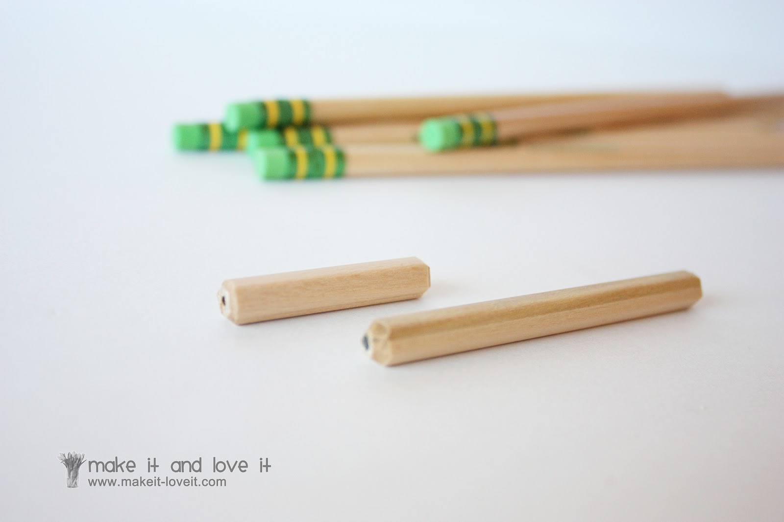 Next, cut up a pencil (or wooden dowel) to create a bridge at each end of the guitar strings. Cut a piece that is 1 1/2 inches and the other one 2 3/4 inches.