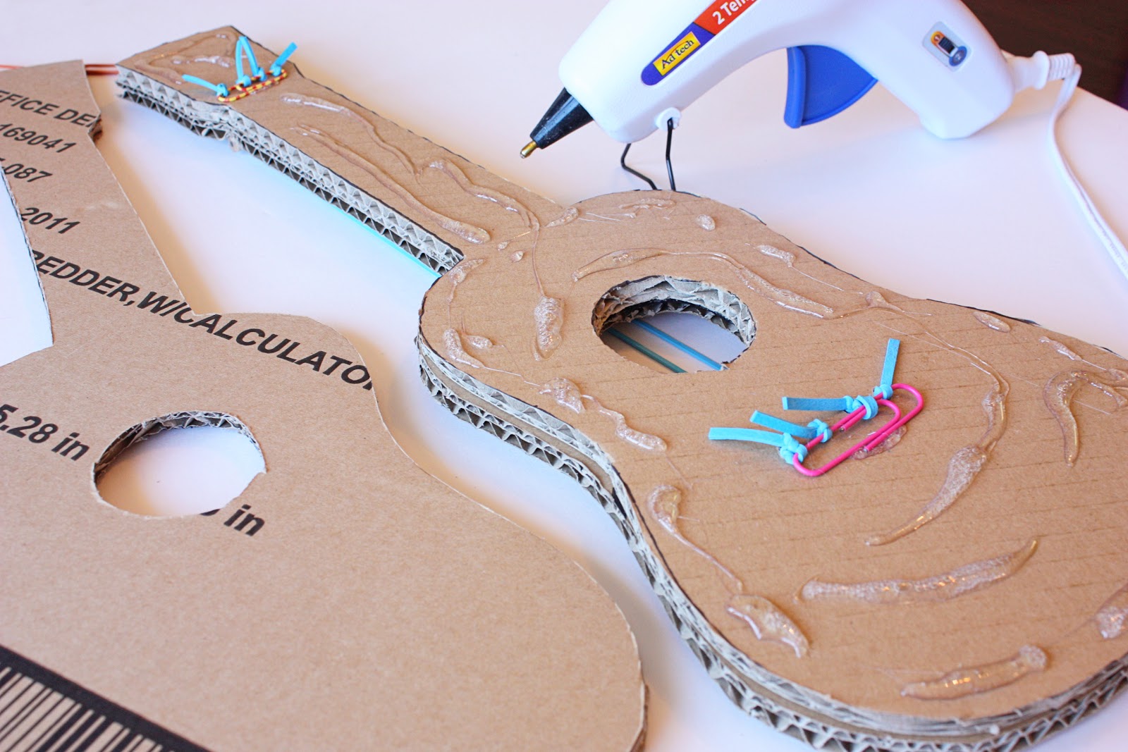 Then, place a good amount of glue along the backside of the guitar with the strings (but don’t get any glue on the rubber bands) and then place the 3rd full size guitar piece onto the back……covering everything up.
