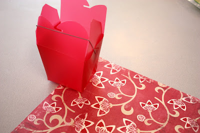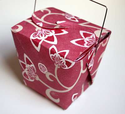 Just open up your pre-made take-out box, trace around it on cutesie paper (you’ll need 2 pieces), cut it out, glue to your take-out box, and fold back up.