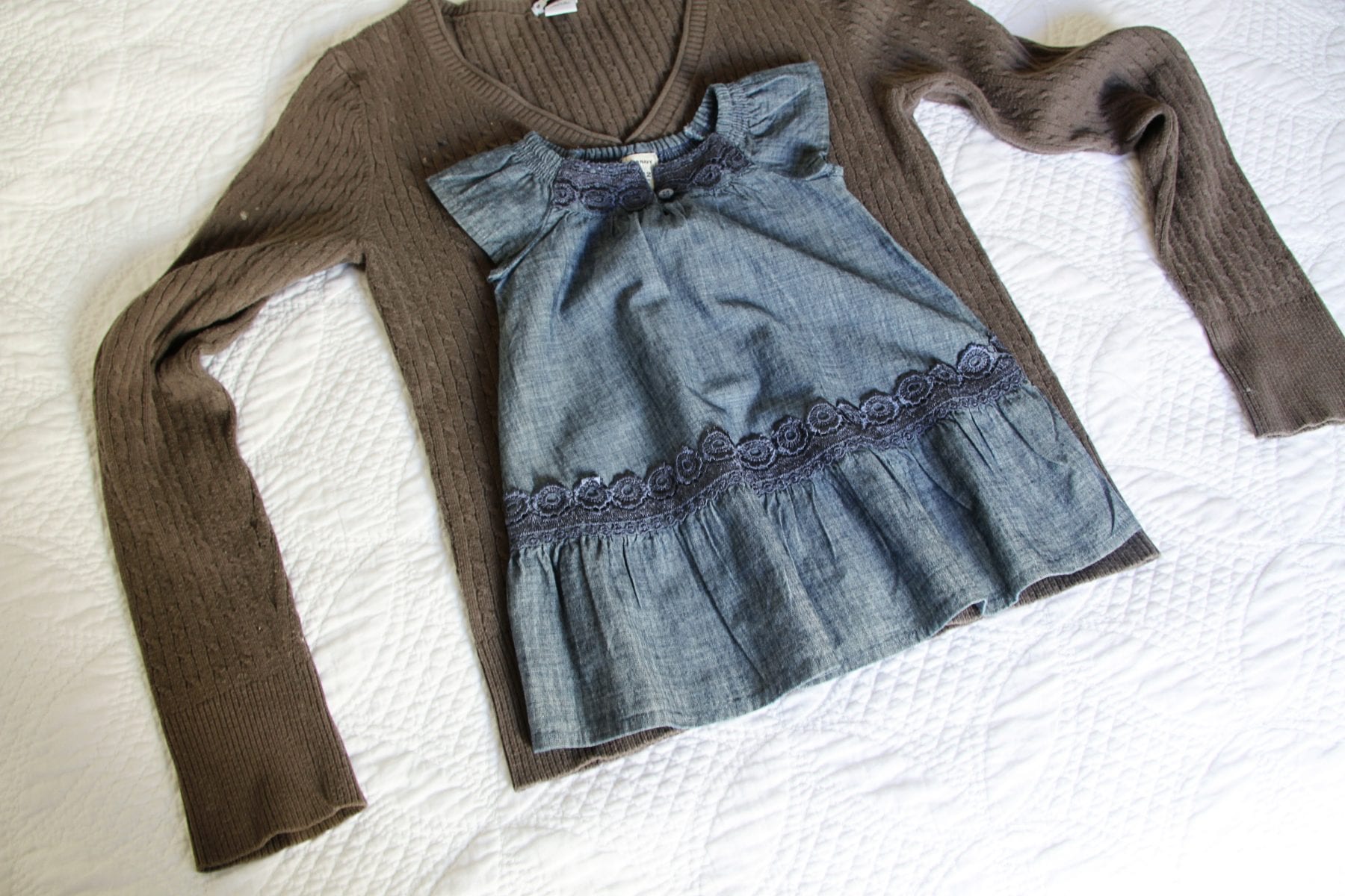 To create your dress, you will need a dress to pattern it after. (It doesn’t have to be a peasant style dress……but finding an A line shaped dress would work best.) Lay your dress on top, lining up the bottom of the dress with the bottom of the sweater, so then you don’t have to hem the finished dress.