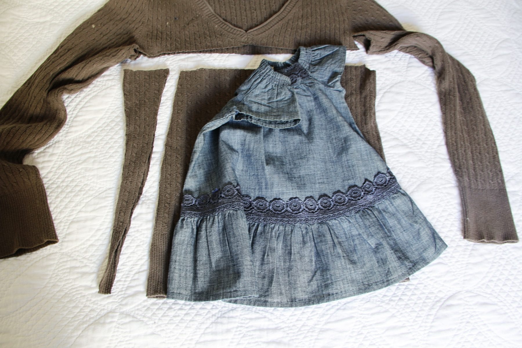 Please Note:Â Because everyone will be using different sized sweaters and will be making dresses of all different sizes, I will be giving directions in very general terms.