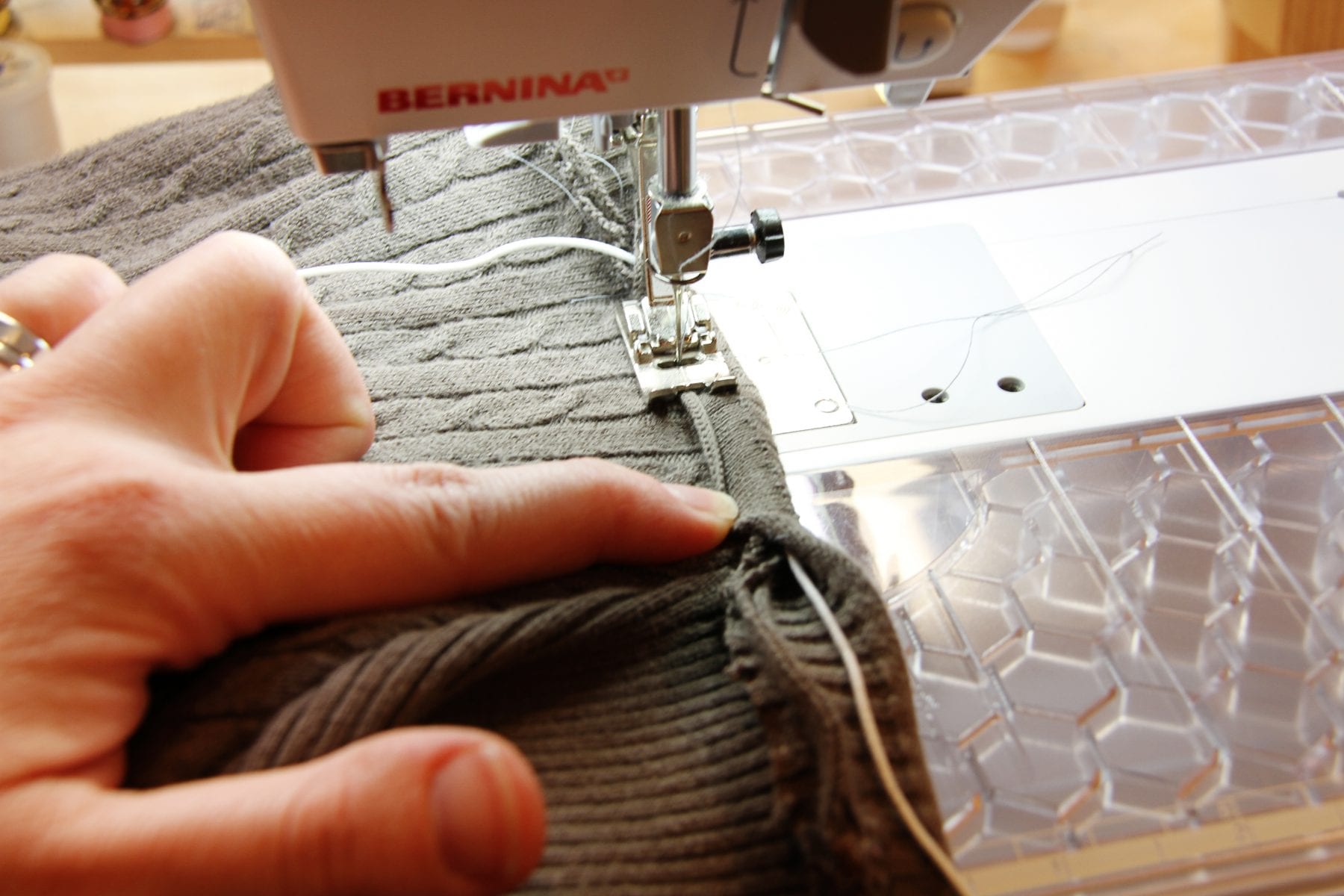 Next, turn the dress right side out and then grab the other edge of the strip from the inside of the dress, and fold it towards the outside of the dress. Cut a piece of cord elastic and place it right under the strip of fabric before folding it over. Leave a tail of elastic in the back as you sew……then sew all the way around the neckline, tucking the elastic under the flap of the strip of fabric. Be sure to not sew over the elastic and keep the strip of fabric nice and even and snug. (Increasing your stitch length will help keep the sweater from stretching out so much as you sew…….but it’s okay if it’s stretches out a little bit because you’ll be cinching it in with the elastic.)