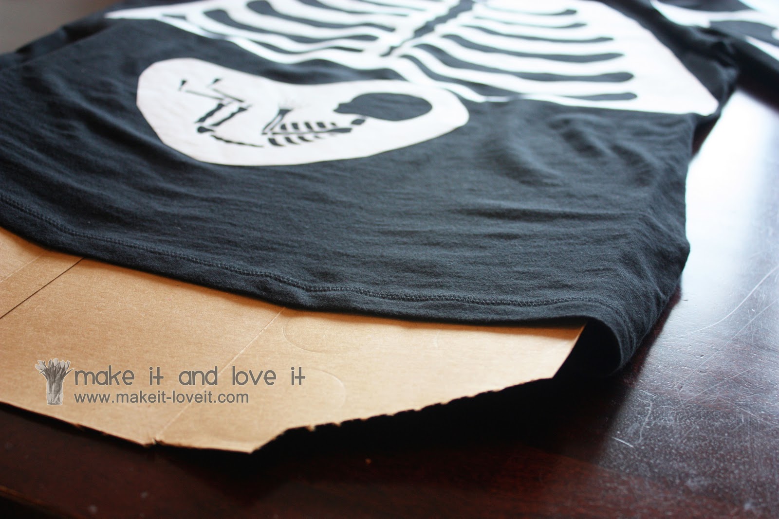 Then, lay your shirt down flat and slide cardboard in between the shirt layers, to keep the paint form seeping down through both layers.