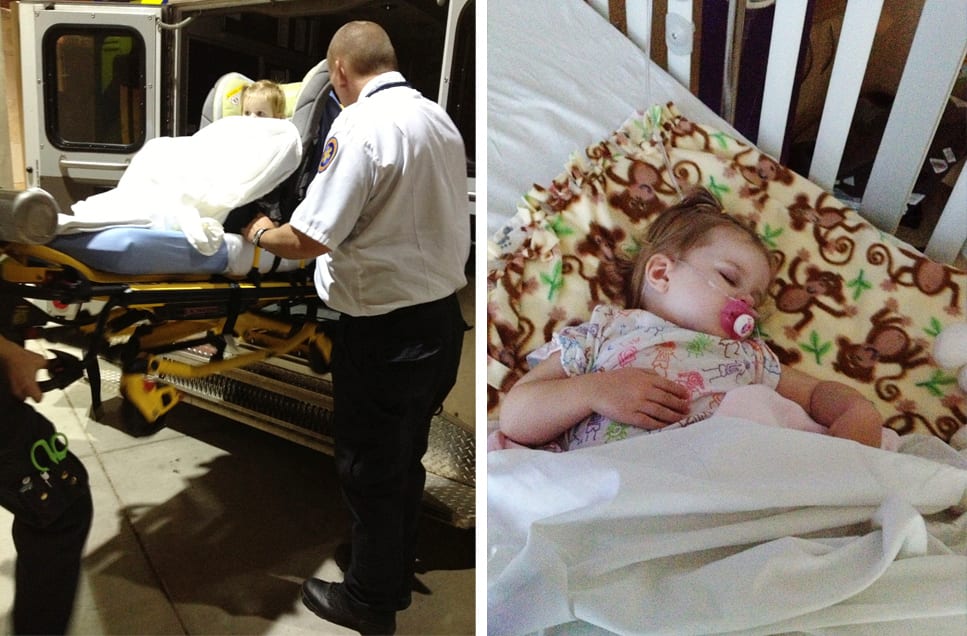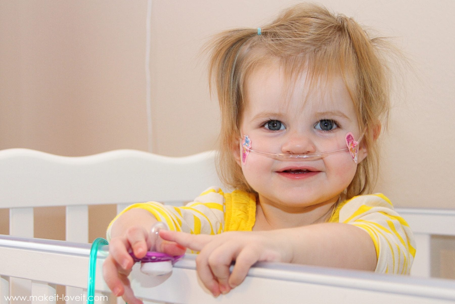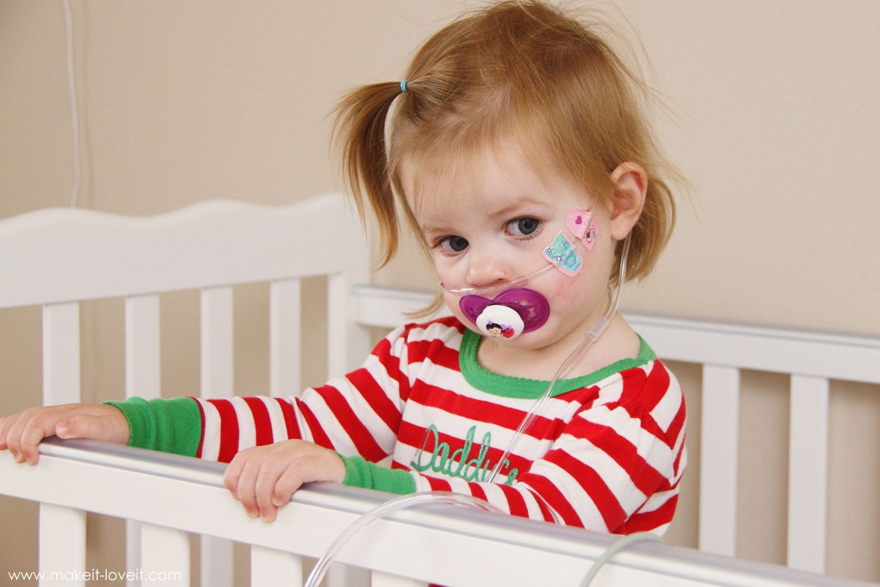 Oh, what happened??! Well, Chloe got a cold last week. Which quickly turned ugly a day later. She was having the hardest time breathing and her sweet little chest was retracting so hard, just to get a breath. So, off to the ER she went, with daddy. Once there, she received lots of meds, and quickly lost her tummy in all the commotion……all over her daddy (I told him, “…welcome to my life!”). The Dr told Steve that they wanted to send her to a bigger hospital, with a children’s wing. So after a parent swap (so puke-soaked daddy could go home) and a crazy transport in an ambulance, little Chloe and I settled in for the night, at 2 am. Oh wait, no settling happened. Because that was the start of that wretched oxygen tube up her nose. It was a battle. But she finally gave up in exhaustion and let that tube force the needed oxygen inside of her little toddler lungs. And allowed the nurses to mess with her and adjust her cords and monitors ALL…..NIGHT…..LONG. Whew.