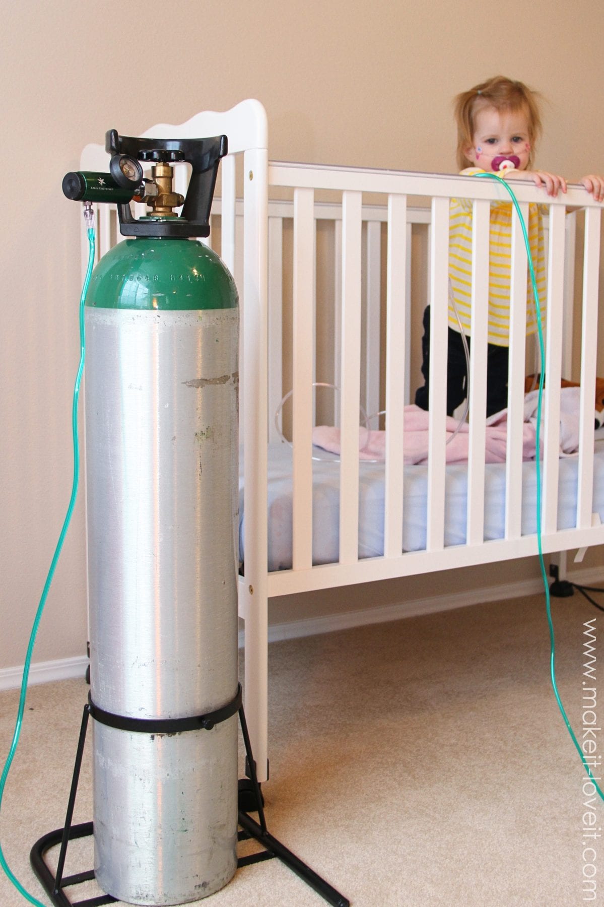 Our little Chloe has been a bit sick for the past few days. She has kept her momma (and daddy) nice and worried……and a little busy. Even though she fought it by screaming/twisting/kicking/squirming at first, she now lets us put the oxygen tube in her nose. With only a slight grunt in protest now. And we all giggle because she looks like our little ol’ granny, pulling her O2 tank behind her. Teasing her keeps the mood light and she has become possessive over her cords and oxygen tank. Sweet little punkin’ head!!
