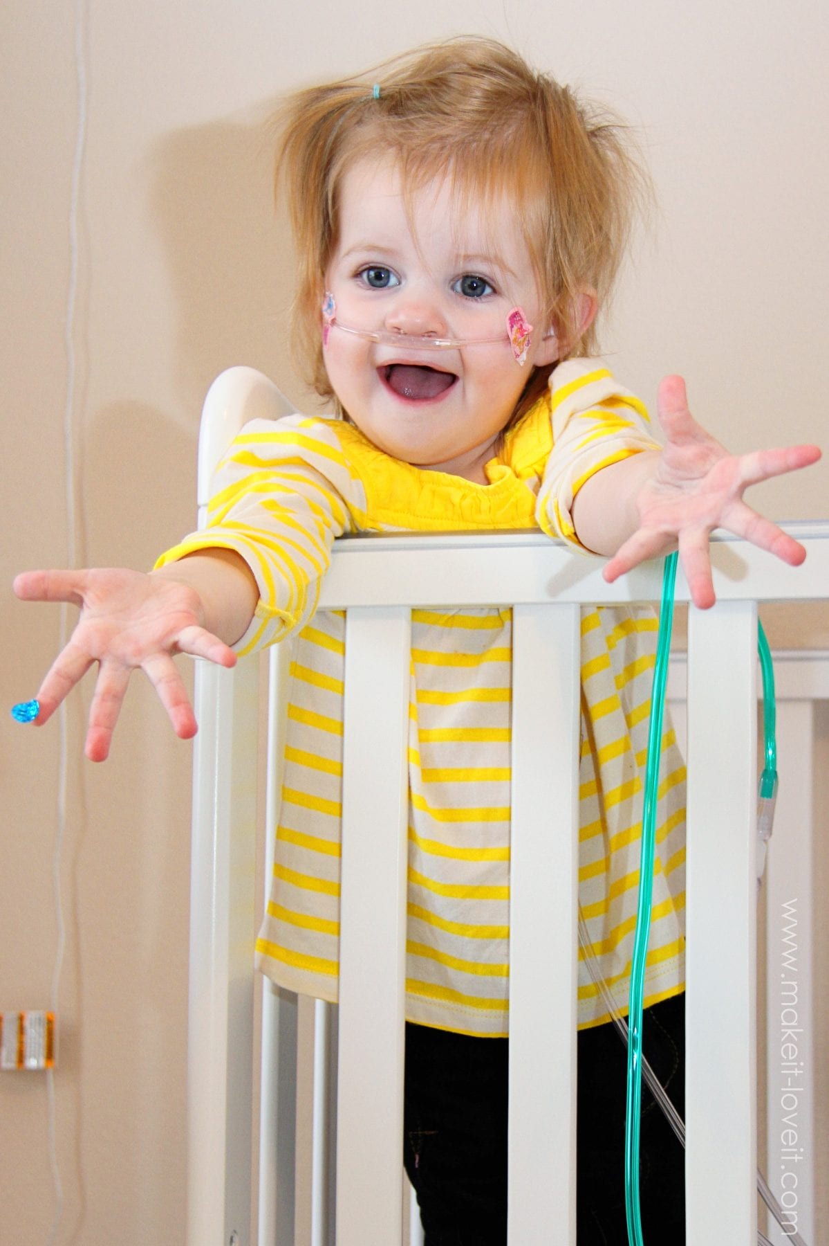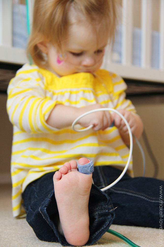 But the real hero…….is the Pulse Oximiter. It measures the amount of oxygen in her blood, from her big toe. She used to HAAATE that thing on her toe. Now, they’re friends. I especially love it because it tells us when her cannula has come out or if the oxygen isn’t working hard enough for her.