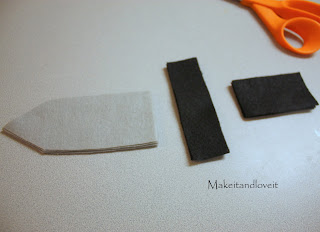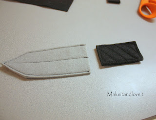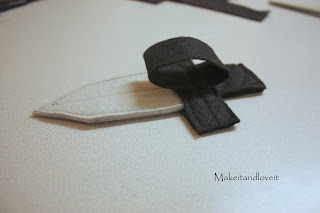 Now time to make the knife for Peter’s belt. I cut out some shapes in felt to construct the knife. And each shape is 3 layers thick, except for the center one….it’s just 2 layers thick.