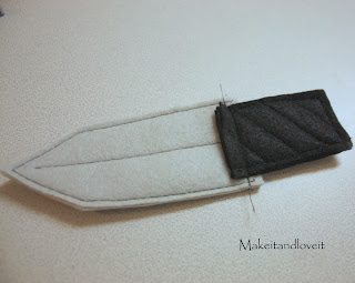 Then lay the last section under and over where the blade and handle meet. Sew all the way around it, securing the knife together as one piece. Then I sewed a little loop onto the back of the handle, so that it could slide onto the belt.
