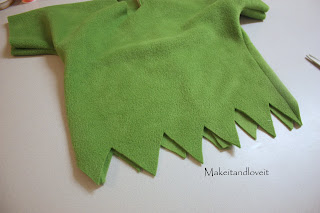Turn it inside out, sew up the sides along the new curves, and then turn it right side out again. Now, make diagonal cuts all along the bottom and sleeves.