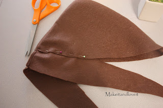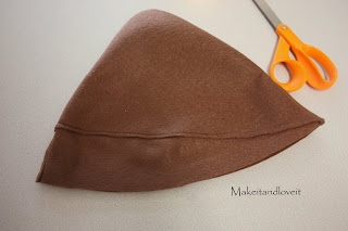 Okay, onto the hat. This may seem a bit confusing….because all I have are shapes to give you. But I cut out a triangular shape with the top of the triangle more towards the back………. and the bottom of the triangle a bit curved. Then I cut a bottom brim section like I did below. I cut two of the triangle section ant two of the brim section……they are stacked right on top of each other.