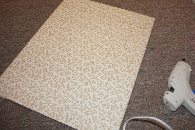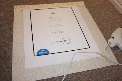 All I did was hot glue some fabric around the inside mat of a 14 x 18 inch frame, put the glass back in, set the fabric covered mat back inside the frame, return the back section to its spot, and then hang.