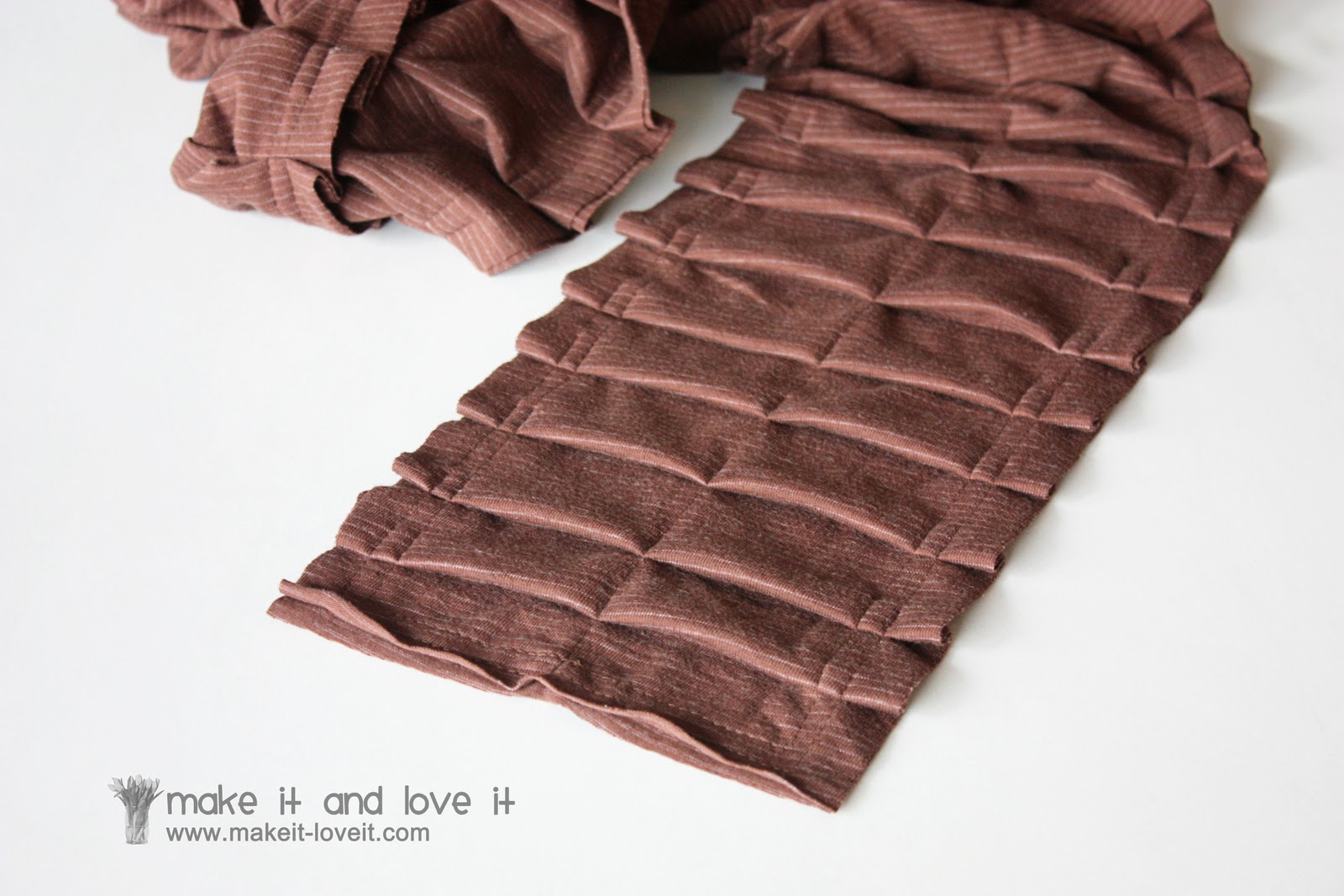 To make the pieces one continual piece each, you would need to purchase at least 3.5 yards of knit. But if you don’t need that much, buy half that much and just piece some long strips together, to achieve the 120 inches. (Or make your scarf a little shorter, or make the pleats smaller, etc. There are ways to get around having to buy so much fabric. I just happened to have plenty of this stuff!)