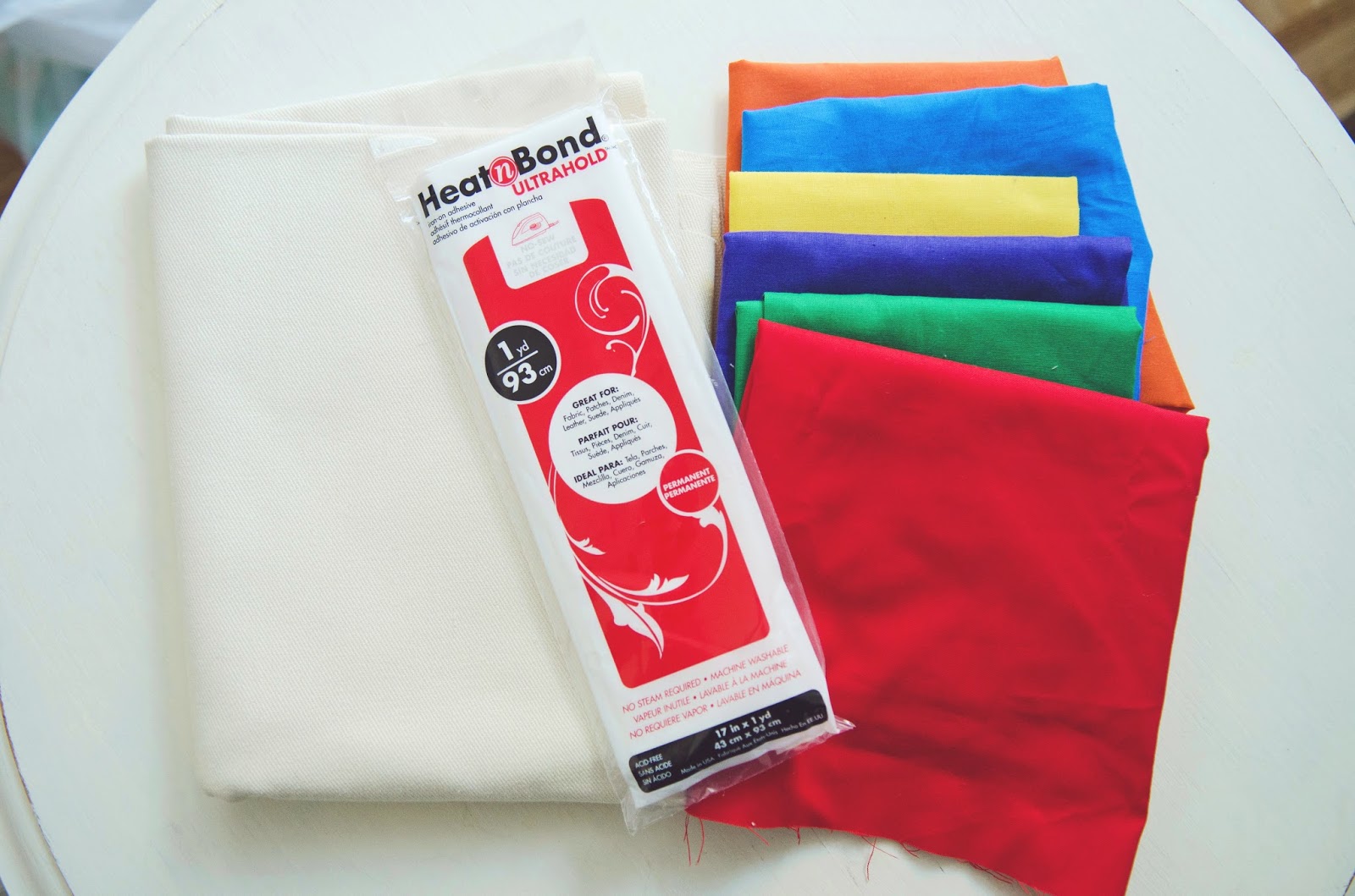 Regular cotton solids are fine for this project. Make sure to get all the colors of the rainbow (fat quarters work great) plus black and white. You may want to write down what the colors of the rainbow are or you could risk leaving a color out. Then you will have to head aaaall the way back to the fabric store for the one color you forgot. Not that I am speaking from experience, that’s just what happened to a “friend” of mine. You also need to pick up a package of Heat n Bond and elastic thread. If your store only carries it by the yard then go ahead and purchase a full yard. Be sure to pre-wash all fabrics so that when your finished project gets dirty you can place it in the wash and not have to worry that it will shrink or lose it’s shape. Okay, now for the technical parts!