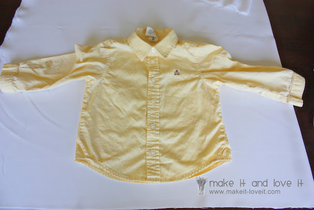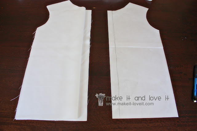 I traced around the bodice of the yellow shirt and created a paper pattern to use. (Make sure to include a 1/2 inch seam allowance and several inches to the bottom to make it a longer jacket. I added another 2 1/2 inches to the bottom on top of that, for a big hem allowance.)