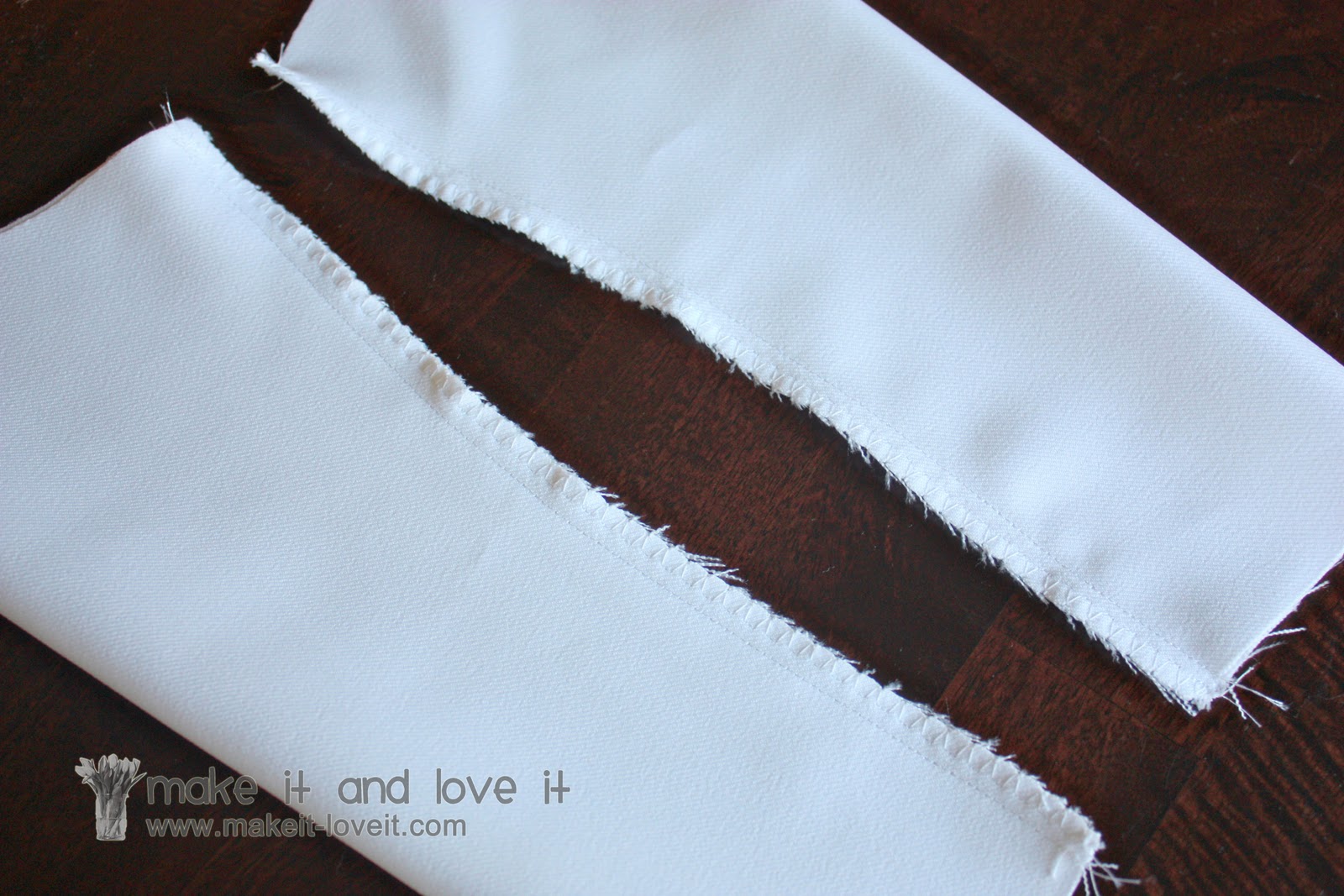 Then fold under the opposite edge of each panel a 1/4 inch, then another 1/4 inch, then sew in place.