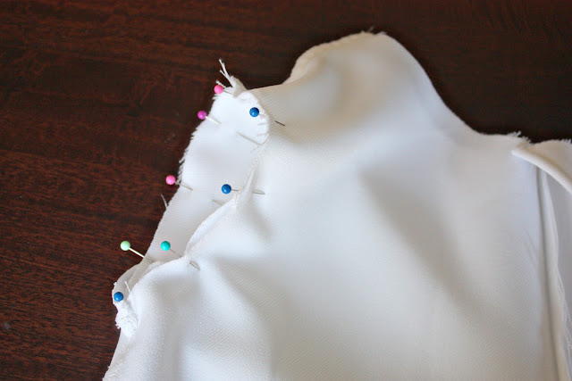 Now, turn the bodice inside out and sleeves right side out and slide each sleeve into the arm hole openings of the bodice, matching up the side seam of the bodice with the side seam of the sleeve. Pin all along the opening of the sleeve.