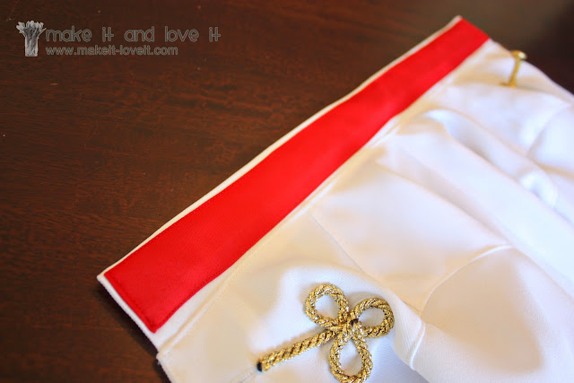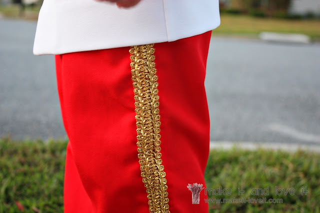 Then I added more of the gold trim that I used for the mock collar but added 2 rows of it along each side of each pant leg.