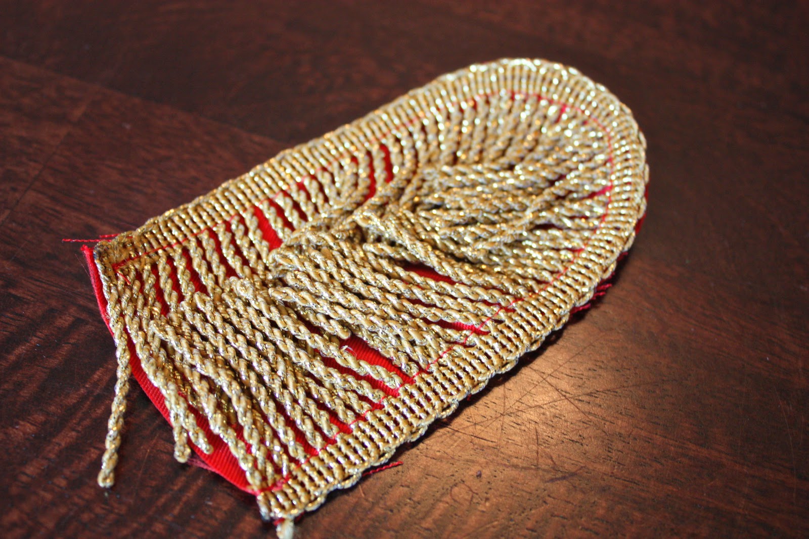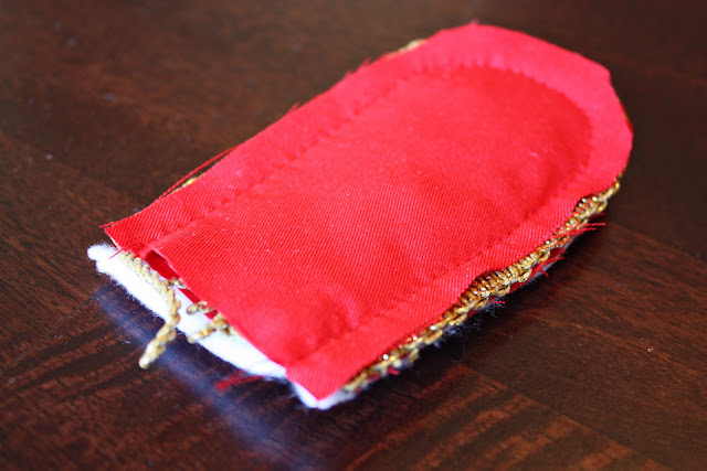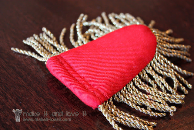 Then I cut out some gold fringe that was long enough to go around each rounded edge of the red fabric.