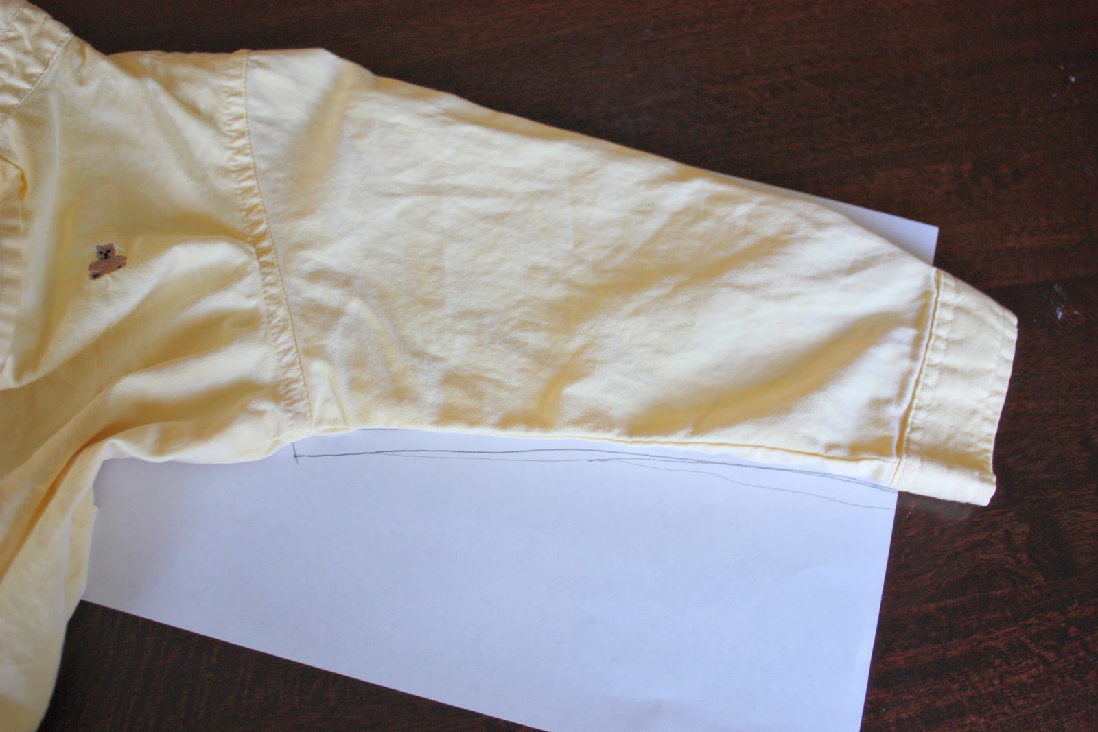 Now, trace around your sleeves, and make a pattern for the sleeves of your jacket. (Make the wrist area of the sleeve a bit larger in circumference than a button-up shirt. Because button up shirts are a bit pleated above the cuff and have a button opening for little hands to get through. Your jacket will not.) Also, make sure to add a 1/2 inch around your paper pattern for your seam allowance.