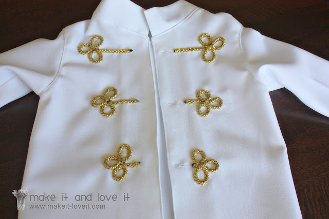 I really liked that gold swirly detail and the brass buttons on the front of the jacket (from the link above), so I bought some gold trimming that was like a cord and twisted it around on the front of the jacket to see what would work. Then I used a pencil to mark where I would be attaching the gold cording.