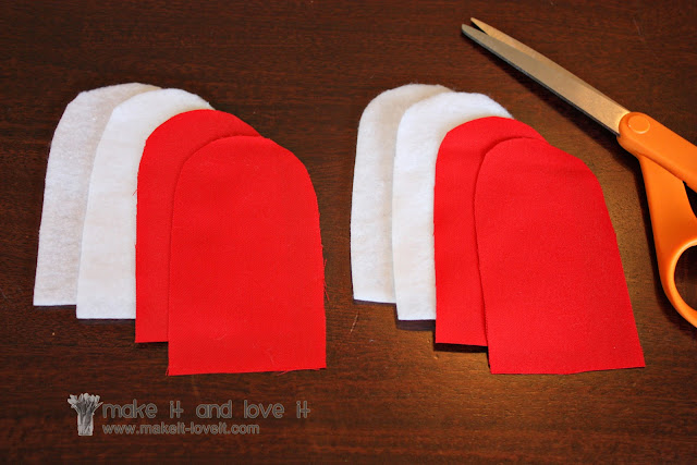 I first decided how big to make my rounded shoulder pad section and then added a 1/2 inch seam allowance to the rounded side and an inch to the flat side. Then I cut out 4 pieces in the red and 4 pieces in felt.