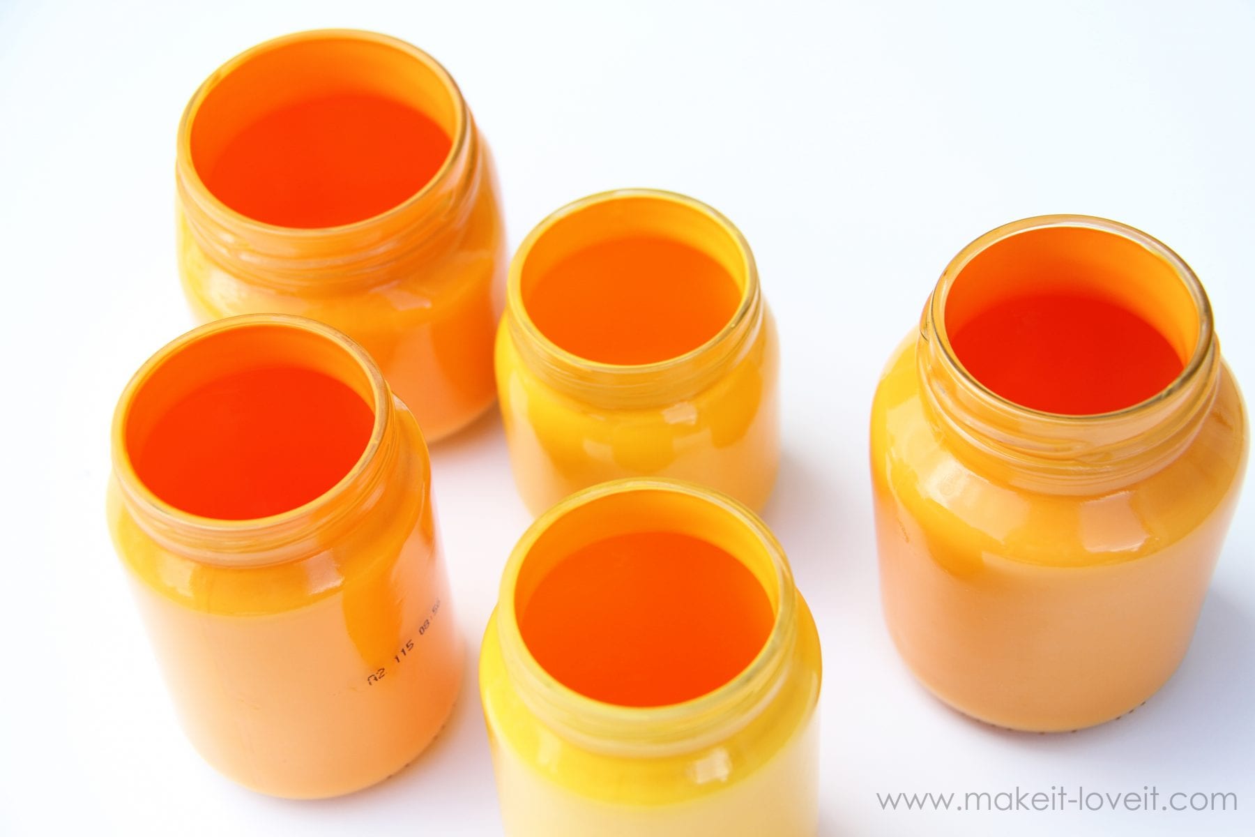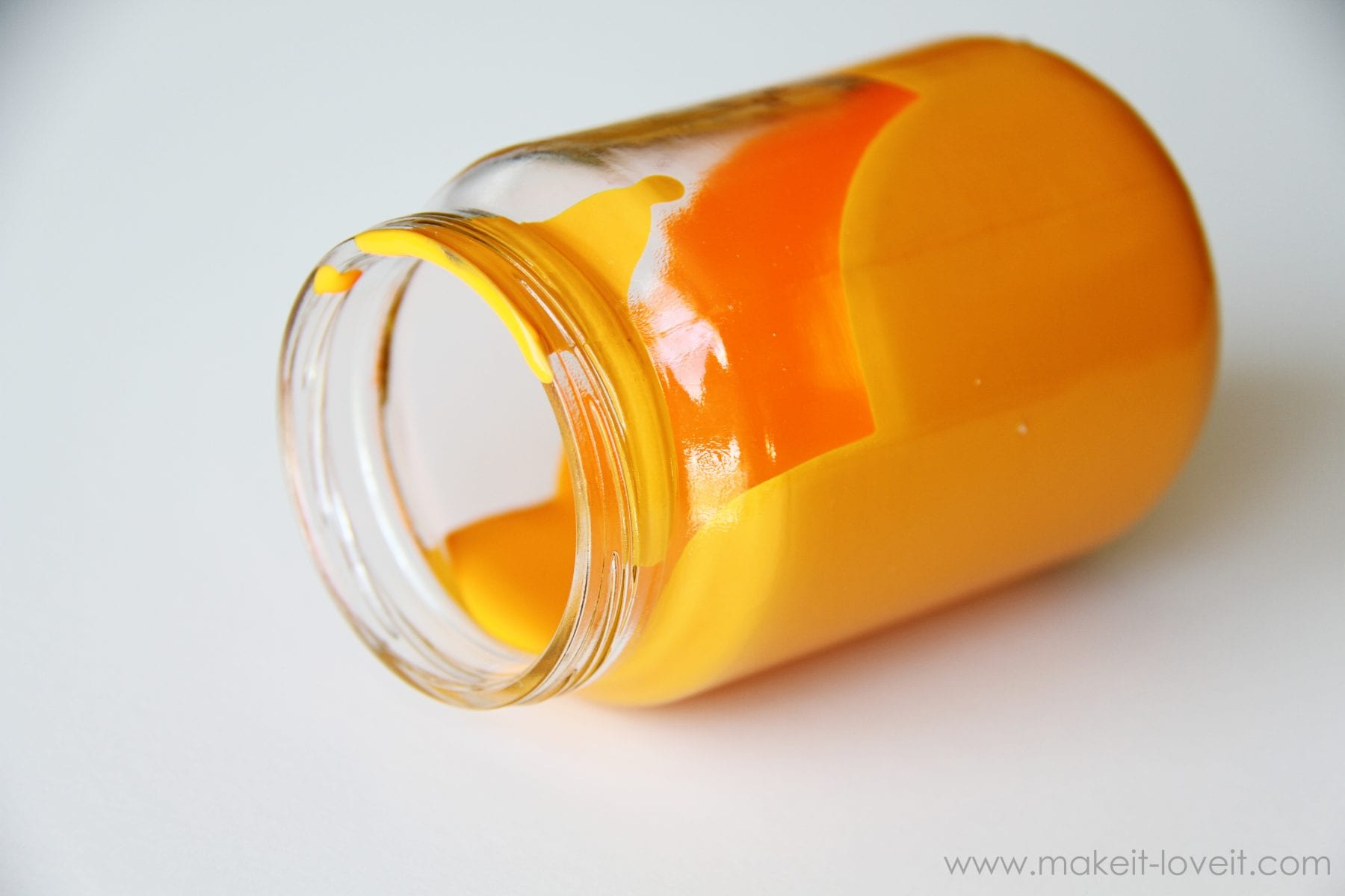 I purchased an orange and a yellow color acrylic paint, to give variety to my shades of orange.  Whatever color you choose, you’ll need to add a little water to your paint, to thin it down just a bit.  You don’t want it watery or it will look clear-ish on your jar.  Leave it just thick enough to be able to spread around the insides of the jar.