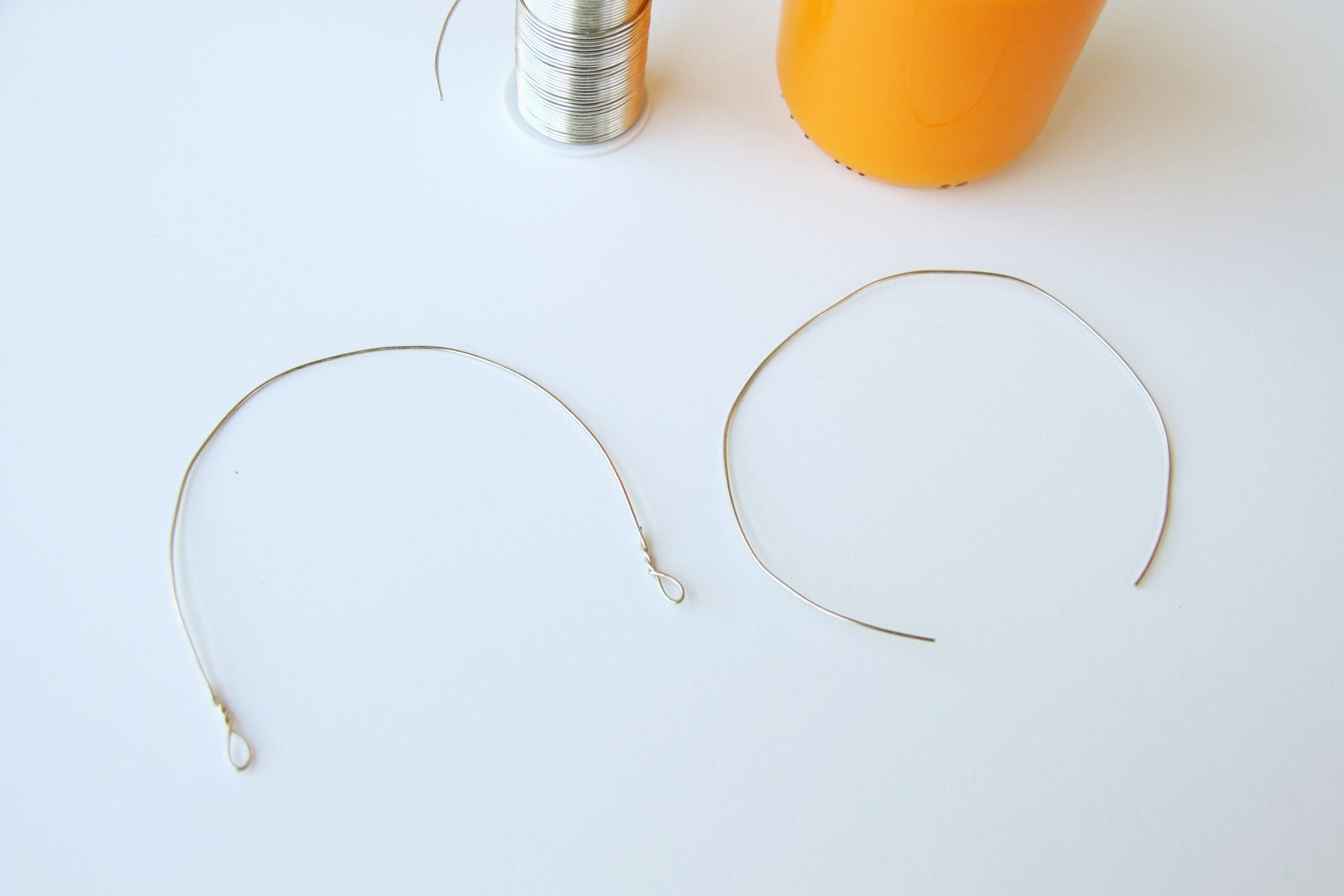 Then, cut a piece of wire that was long enough for a handle, plus an extra 1/2 inch on each end.  Fold up each end a half inch and leave a little opening at the ends……and then twist the rest around the main part of the wire. (shown on the left)